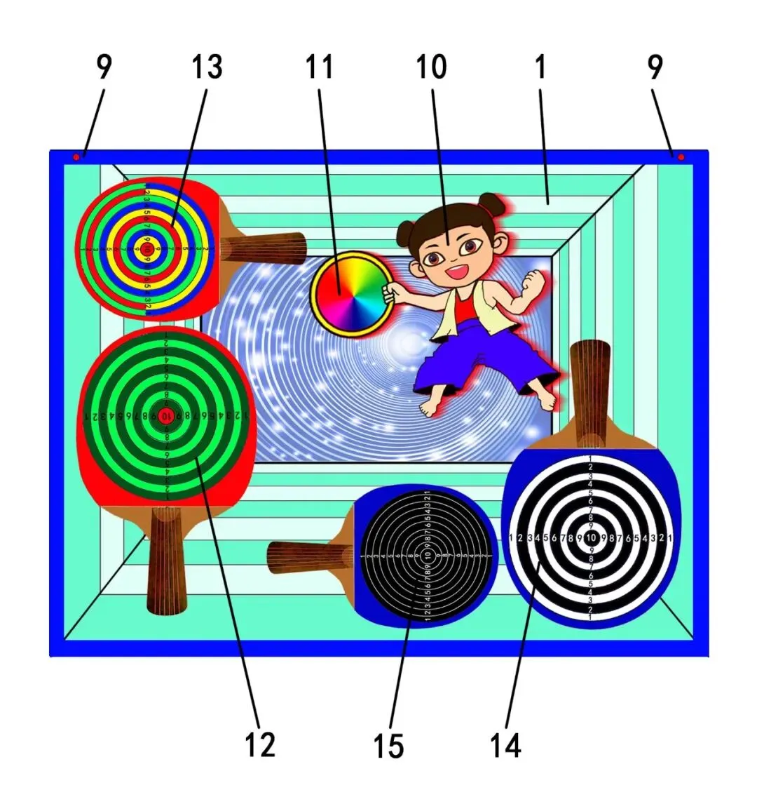 在电视动画上,让传统文化故事中的功夫高手哪吒控制四个乒乓球拍,在四个乒乓球拍上分别画出10环绿色圆环靶、彩色圆环靶、黑白圆环靶和黑色圆环靶,同时让哪吒控制乾坤圈和混天绫。在上述情况下,让电视动画上的哪吒成为动画人物打球者,让哪吒掌控绿色圆环靶、彩色圆环靶、黑白圆环靶、黑色圆环靶、乾坤圈和混天绫六种互动工具,跟撞击电视屏幕动画图像的乒乓球进行互动,跟用户对打同一个乒乓球,进行对抗式打乒乓球比赛。