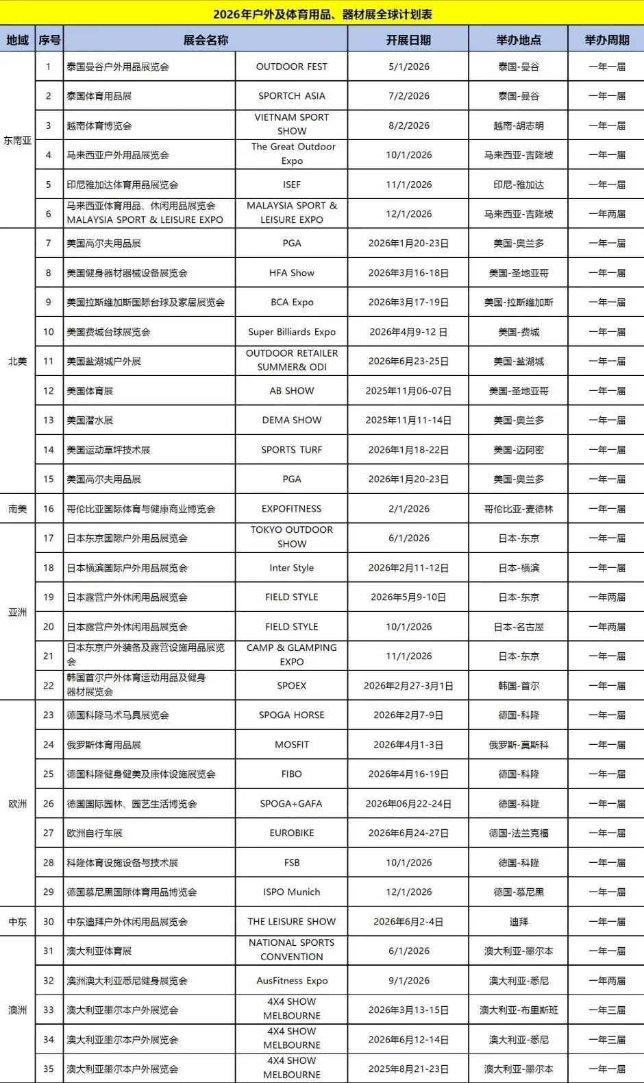 2026年户外及体育用品展全球计划表