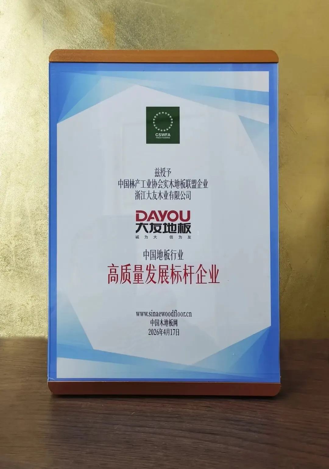 2026年4月17日,大友地板凭借在品质、创新与绿色发展上的卓越表现,正式荣膺 “中国地板行业高质量发展标杆企业” 称号,再一次用实力彰显行业领军者的担当。