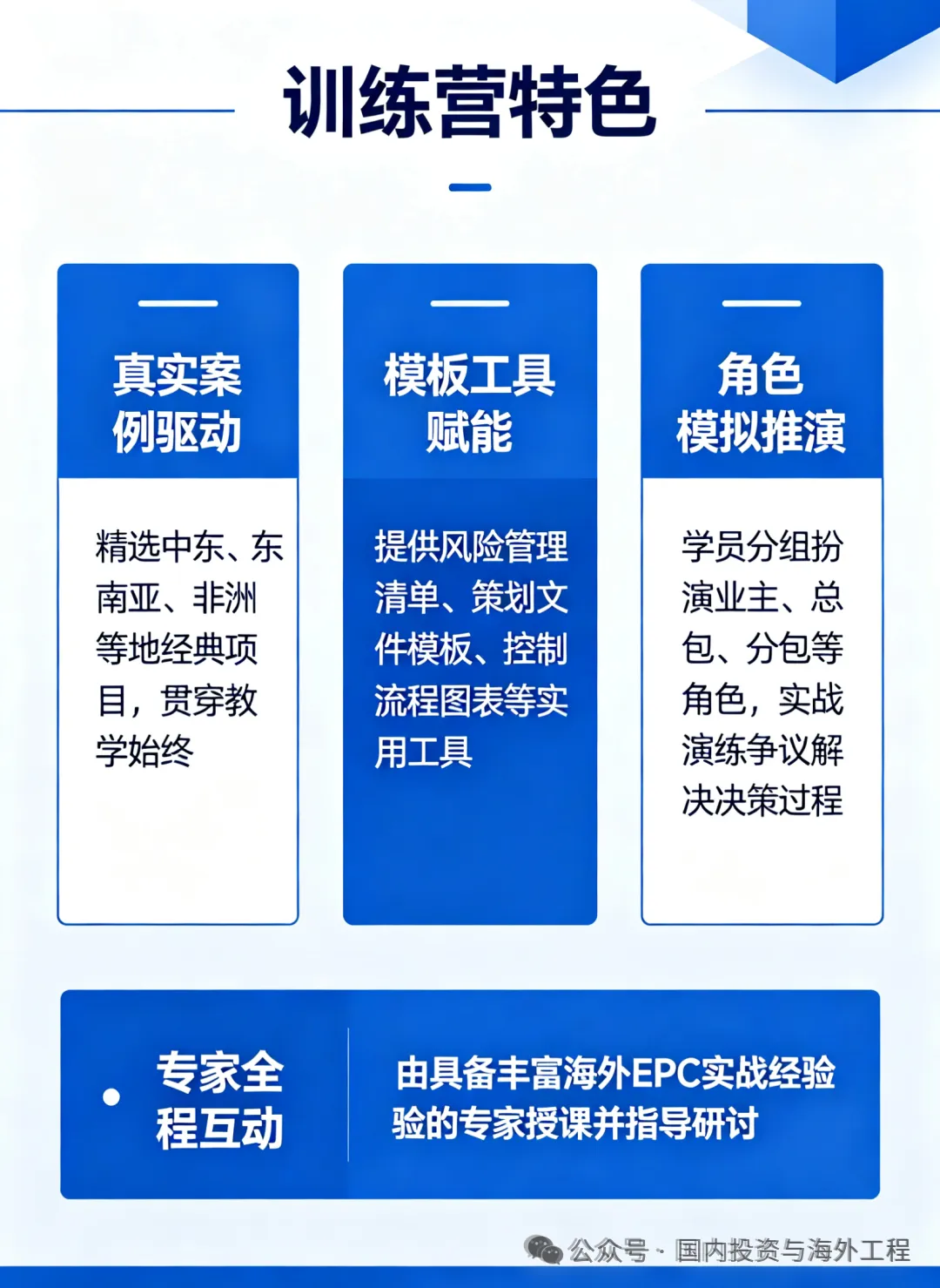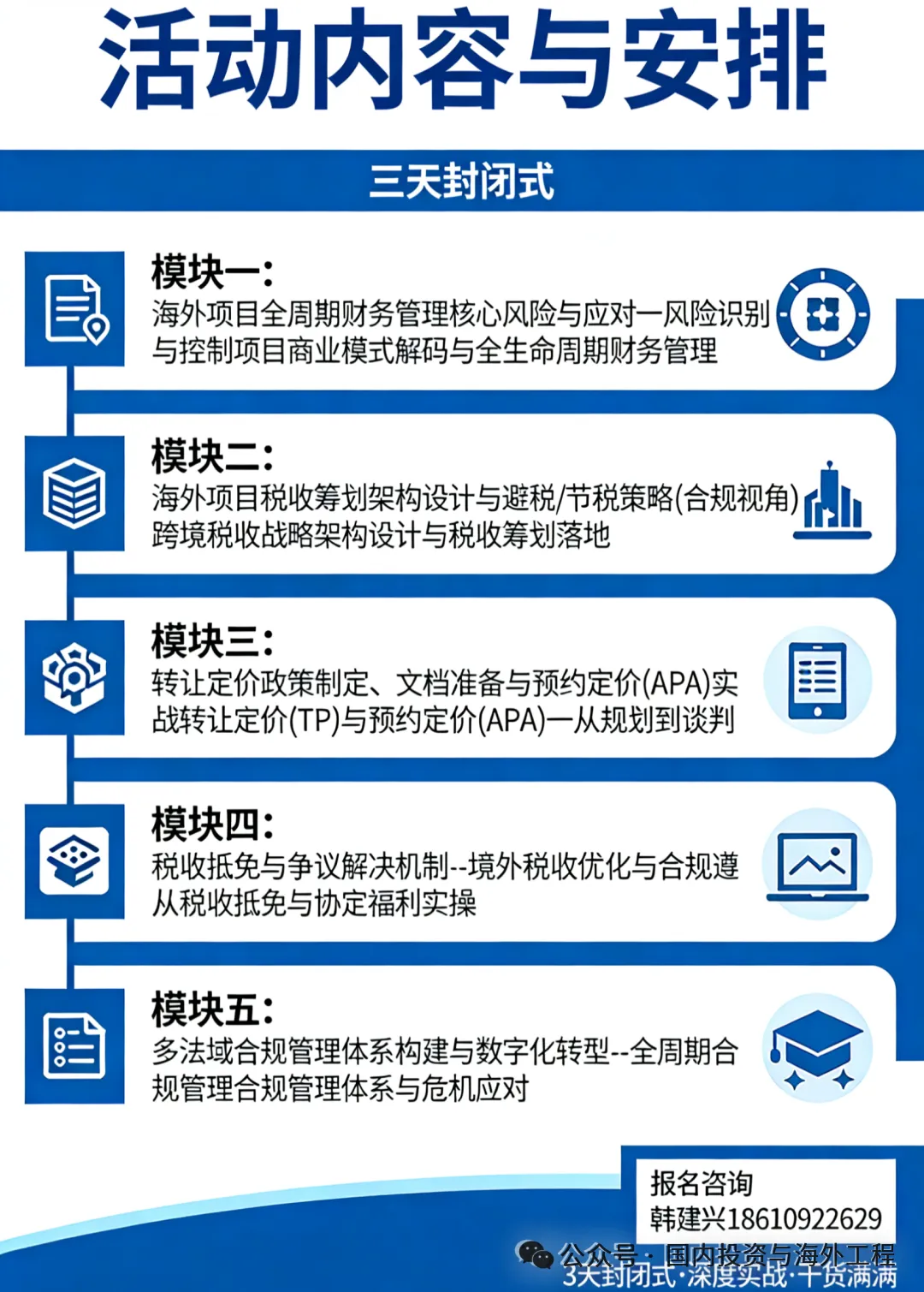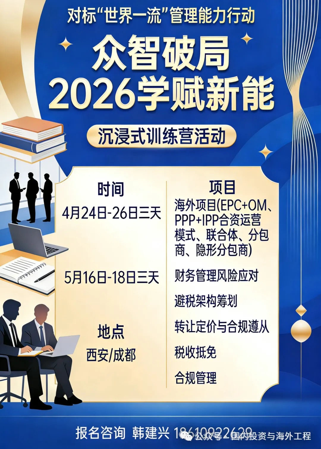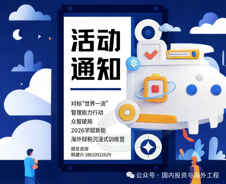 随着全球化进程的不断深入与中国企业“走出去”战略的加速实施,海外工程项目(如EPC+OM、PPP+IPP合资运营等复杂模式)已成为众多企业开拓市场、提升国际竞争力关键领域。然而,海外经营环境复杂多变,尤其在财务管理、税务架构、转让定价、合规遵从等方面风险集聚、挑战严峻。为助力企业海外业务团队、财税管理人员及项目核心决策者系统掌握前沿知识、提升实战能力,我们定于【4月24日-26日三天 / 5月16日-18日三天 】分期在西安/成都举办:众智破局2026学赋新能 海外项目(EPC+OM、PPP+IPP合资运营模式、联合体、分包商、隐形分包商)“财务管理风险应对、避税架构筹划、转让定价与合规遵从、税收抵免、合规管理”沉浸式训练营系列活动。随着“一带一路”倡议的深入推进与全球基建市场蓬勃发展,中国工程企业承接的海外EPC项目日益增多,项目规模与复杂度持续升级。在联合体合作、多级分包的管理模式下,项目成功高度依赖于系统性的策划、精准的风险管控以及全过程要素的协同管理。为助力企业核心管理人员及项目团队提升国际化项目管理能力,掌握前沿管理工具与实战策略,我们将于6月9日-12日(9日报到)在长沙举办海外EPC工程、联合体、分包商“项目管理策划、项目管理风险、项目要素管理和控制最佳实践案例及全过程管理”沉浸式训练营活动。报名方式:请电联或添加微信索取活动邀请函文件并填写报名回执表