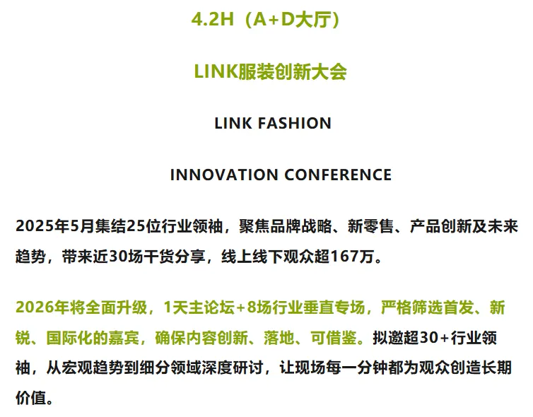 2026年5月13-15日,LINK FASHION服装展会(上海)盛大举办!服装定制、职业装·团服、校服·园服、时尚女装、针织、服装智能制造六大主题璀璨集结,2000+品质源头工厂与品牌商,共同为您呈现前沿趋势、新品爆品与高效的供应链资源。