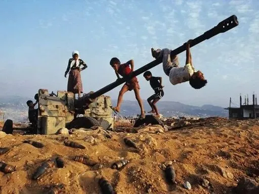:欢笑的孩童 vs 沧桑的老人;庆典 vs 废墟