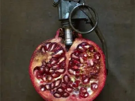 :盛开的石榴(生命)与手榴弹(暴力)。