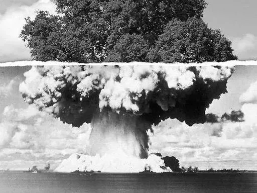 :纯净的冰山 vs 黑色的煤渣;古树 vs 蘑菇云。