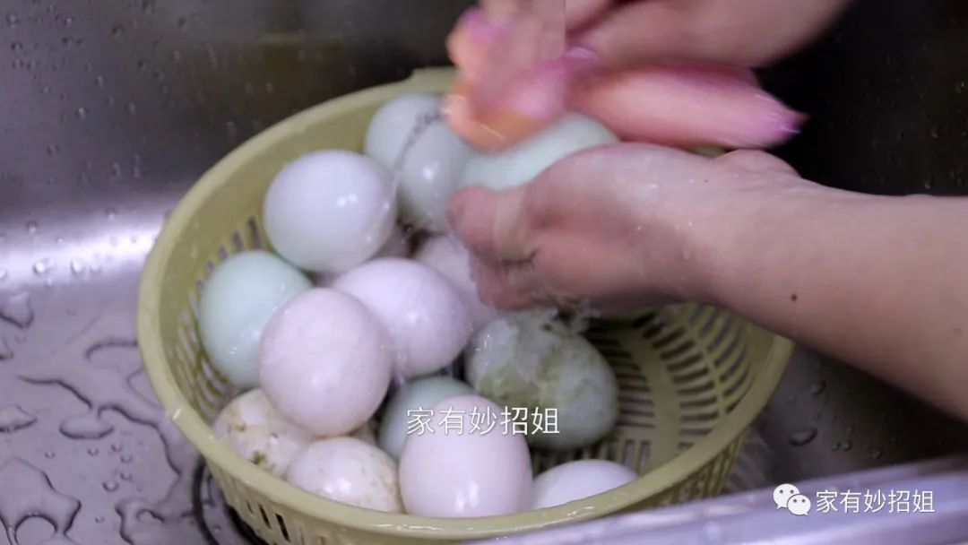鸭蛋清洗好,我们用清水多冲洗几遍,将表面的残留都冲掉。接着再将鸭蛋表面的水分控干。我们可以把它放在通风处晾干,也可以用纸巾一个个的擦干。但是要注意的是,鸭蛋的表面一定不能有水分,一旦有水分的话,在腌制的过程中,鸭蛋就很容易会变质。