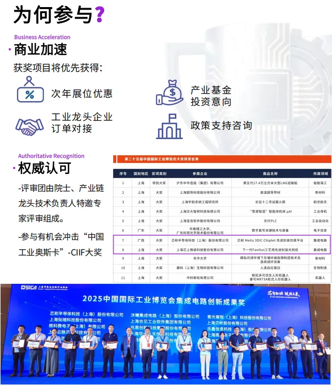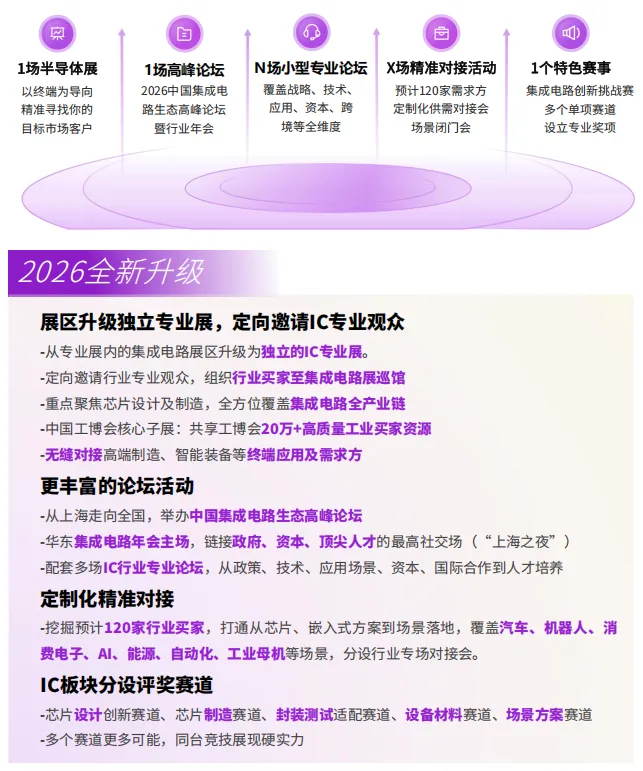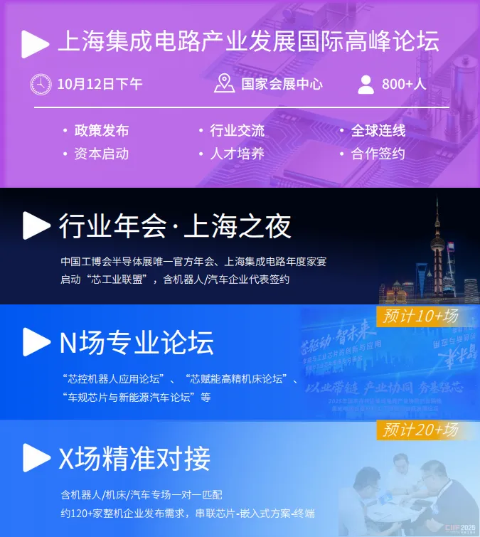 中国工博会集成电路展(国芯展)将以“芯智融合・生态共生・交易赋能”为核心理念,聚焦“从芯片到应用场景的落地闭环”,实现“芯片 设计—特色制程—封装集成—解决方案”的全链路落地。本展强调芯赋能CIIF核心场景(如智能工厂、汽车电子、具身智能等)。展会依托工博会全工业生态优势,创新“展+会+精准对接”模式,同步举办中国集成电路生态高峰论坛、行业年会及多场专业论坛,配套“一对一”供需对接、跨境合作洽谈等活动,增设IC赛道奖项。作为集成电路生态枢纽,这里兼具技术展示与精准交易功能,突出应用场景适配与定制化服务亮点。可一站式实现“展技术-强对接-签订单-聚人才-赢奖项”全链路价值转化,锁定政企、资本、人才核心资源,抢占发展新机遇。