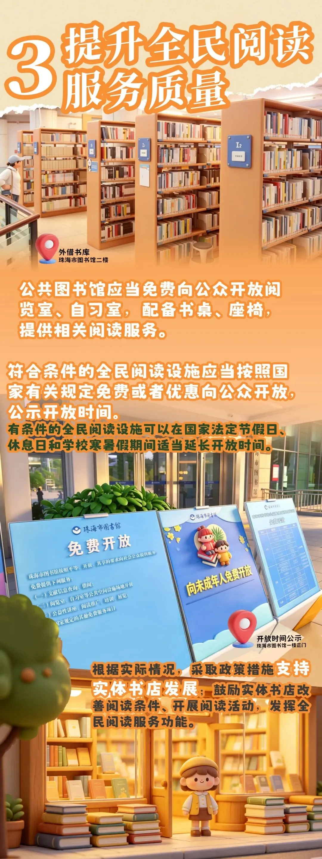 符合条件的全民阅读设施应当按照国家有关规定免费或者优惠向公众开放,公示开放时间;有条件的全民阅读设施可以在国家法定节假日、休息日和学校寒暑假期间适当延长开放时间。