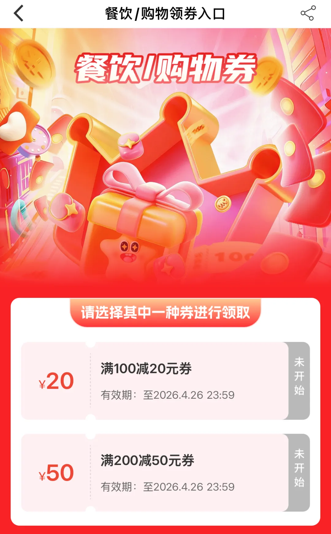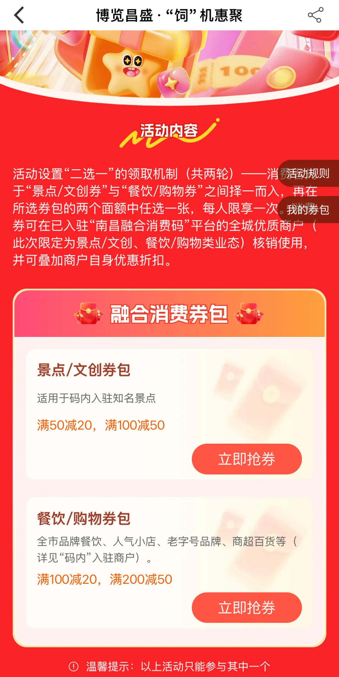 餐饮/购物券包(入口B):满100减20、满200减50,适用于码内品牌餐饮、人气小店、老字号、商超百货。