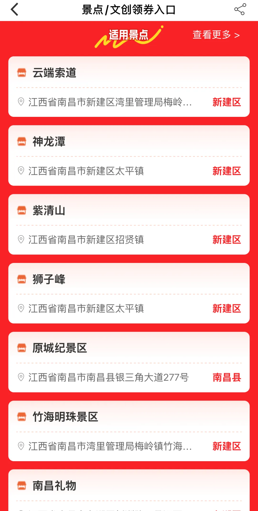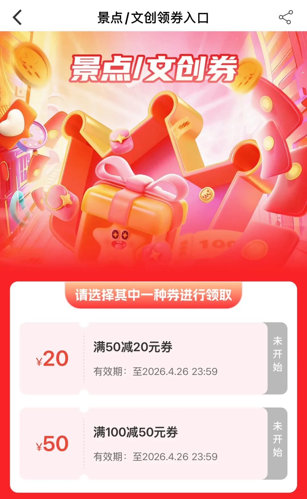 景点/文创券包(入口A):满50减20、满100减50,适用于码内相关景点、文创店。