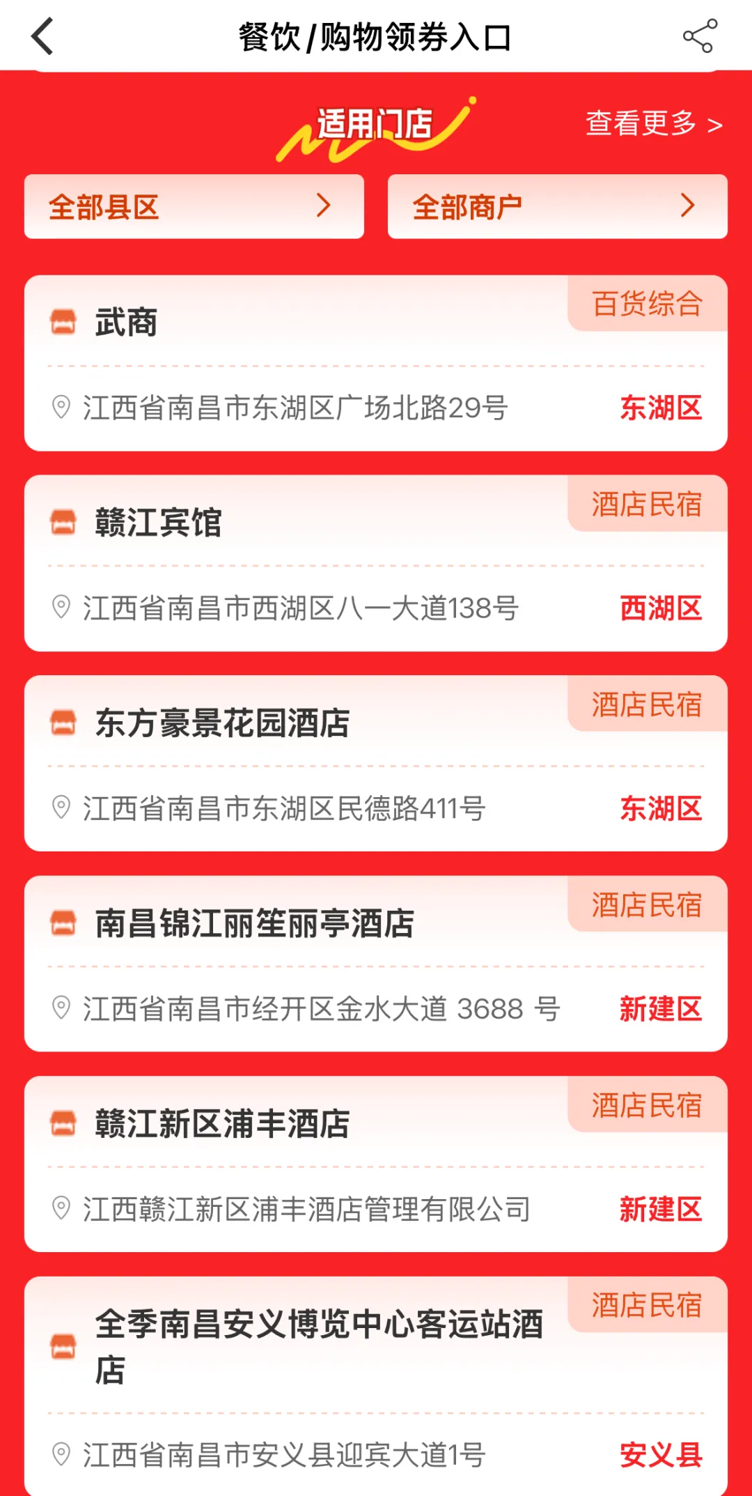 领券后,可在全市已入驻“南昌融合消费码”平台的餐厅、商场、景点、文创店等线下实体门店使用(具体适用门店扫码领券后在活动页面即可查看),通过合作支付平台支付,满足条件自动抵扣。