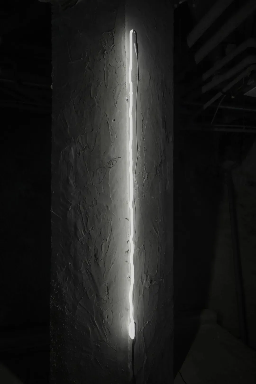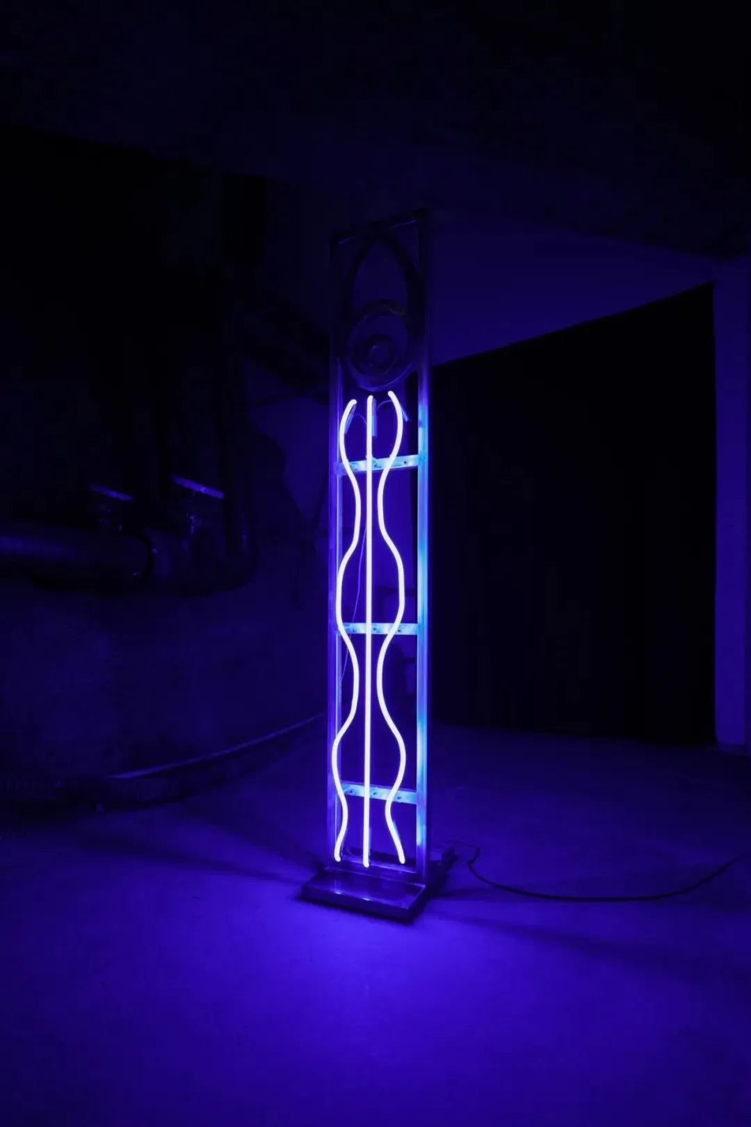 展览以"水是一种生命力"为线索,呈现锻铁与霓虹灯雕塑、独立霓虹灯装置及四件大型玻璃油画。展陈空间由防空洞改造而成,隧道内隐约显露山脊轮廓与曾经流淌的人工瀑布遗痕,为展览的叙事提供了独特的场域起点: