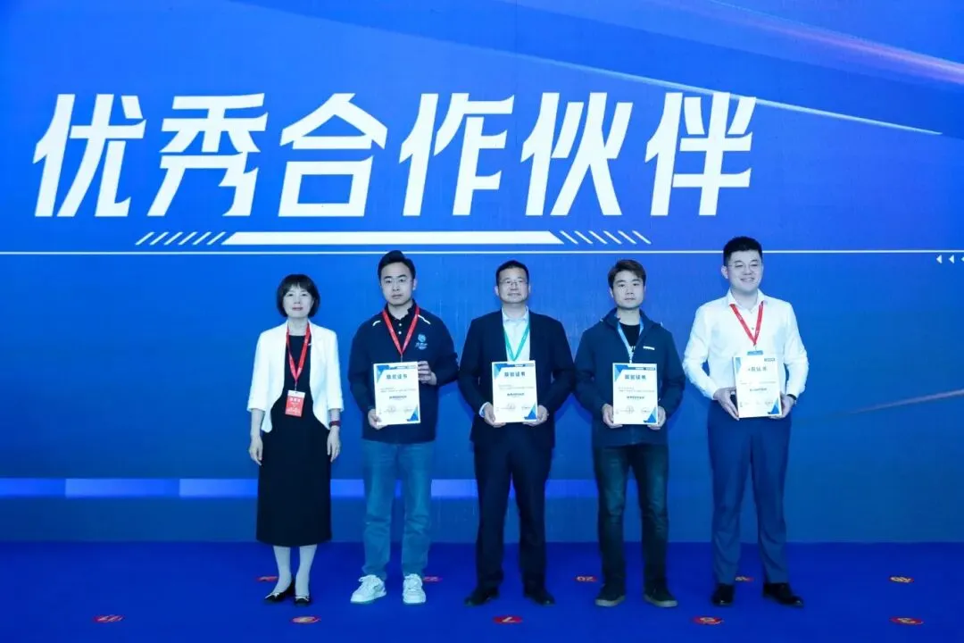 中国建筑材料流通协会系统门窗专业委员会常务副主席、秘书长,山东华建铝业集团常务副总裁丁三莲为“优秀合作伙伴”获奖代表颁发证书