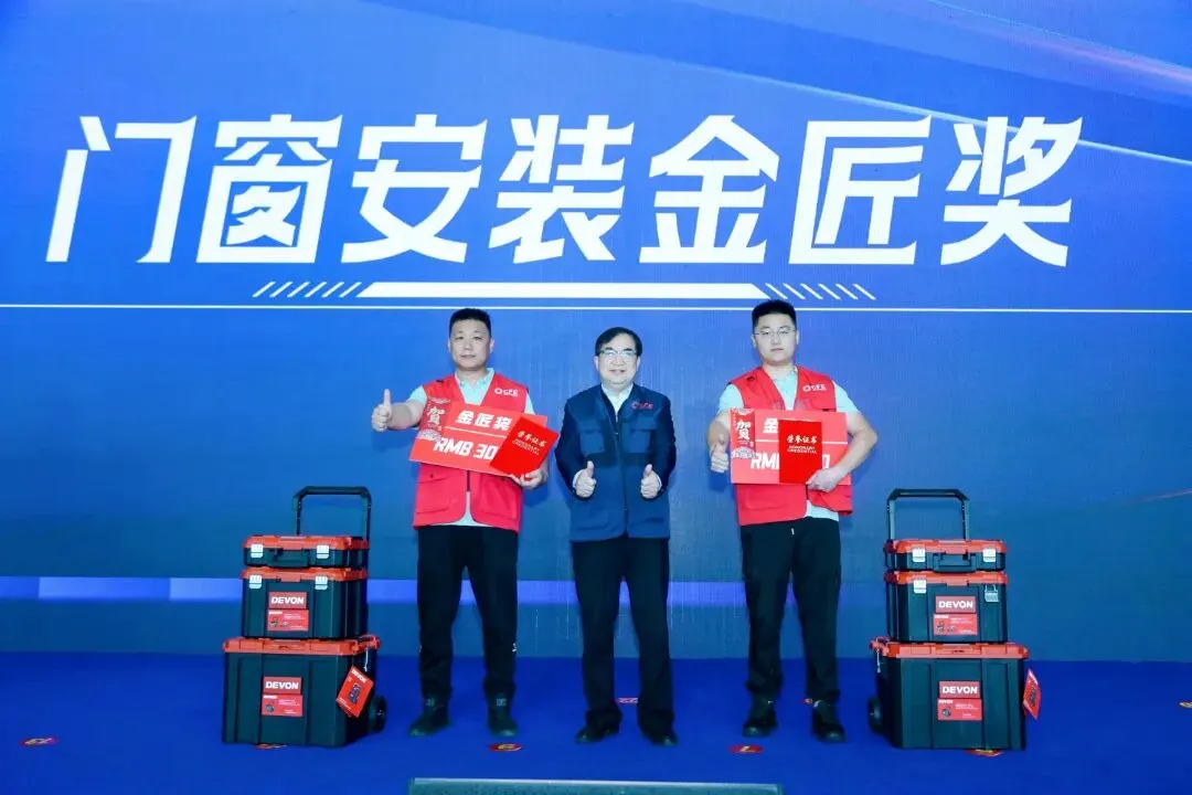 山东易欧思门窗系统科技有限公司常务副总经理陈刚为“门窗安装·工匠奖”获奖代表颁发牌匾和奖金