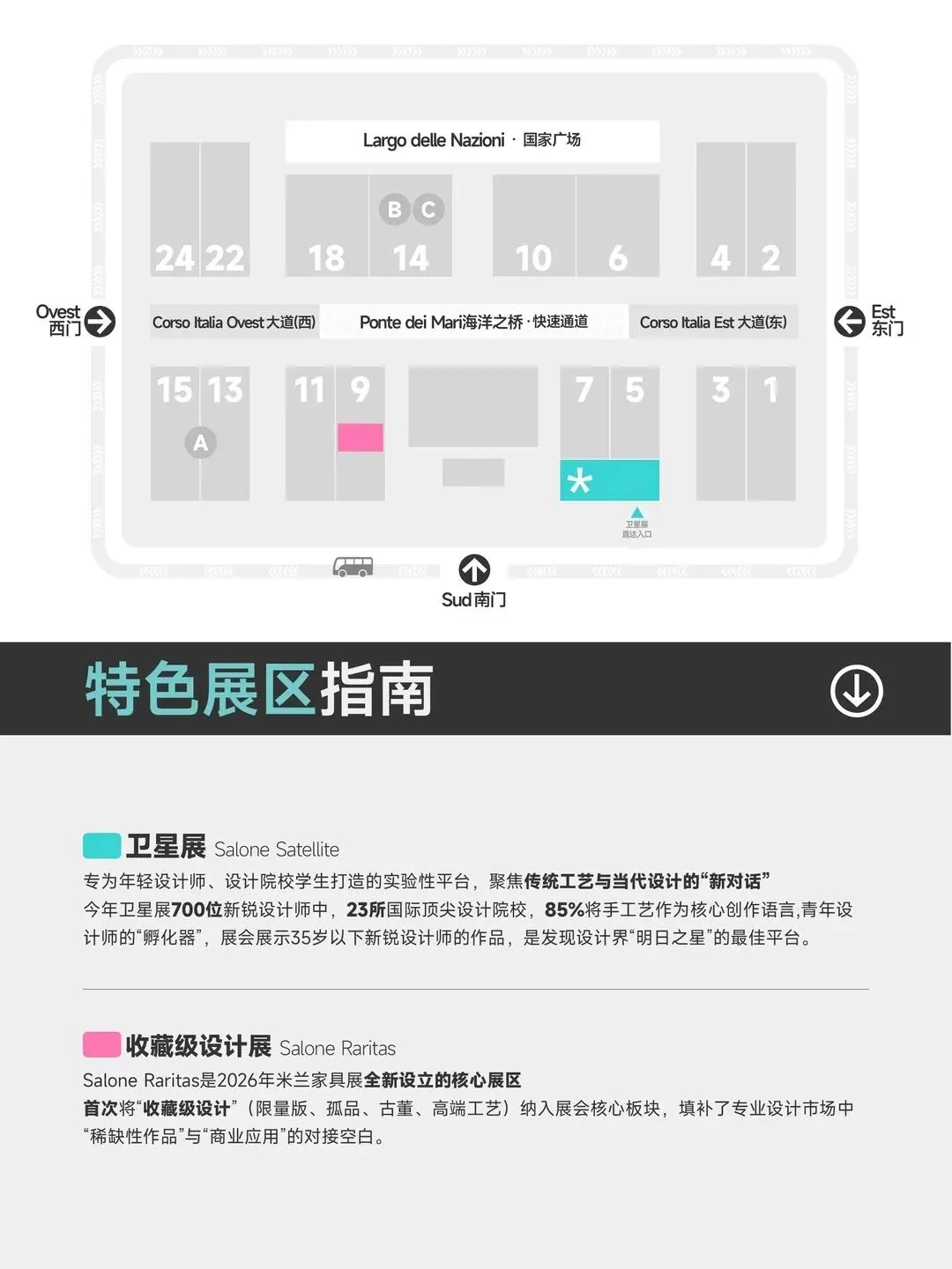 核心区域:9、11、13、15号馆及周边通道。这里是意大利现代设计的中坚力量大本营。你可以在这里一站式看到 B&B Italia、Living Divani、Desalto、Minotti、Natuzzi等顶级品牌的最新系列。风格相对集中,效率极高。