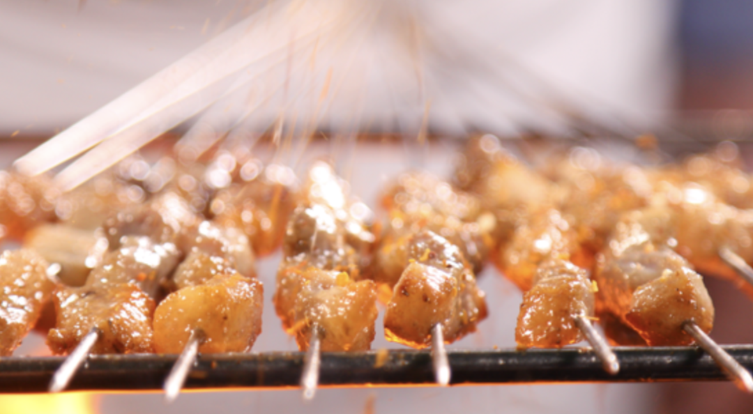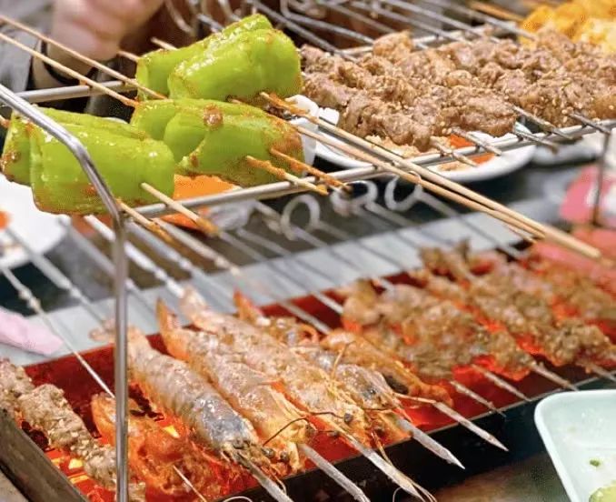 红彤彤的炭火烧炉架上鲜嫩可口的肉串和各种食材,就是最懂你的味道。
