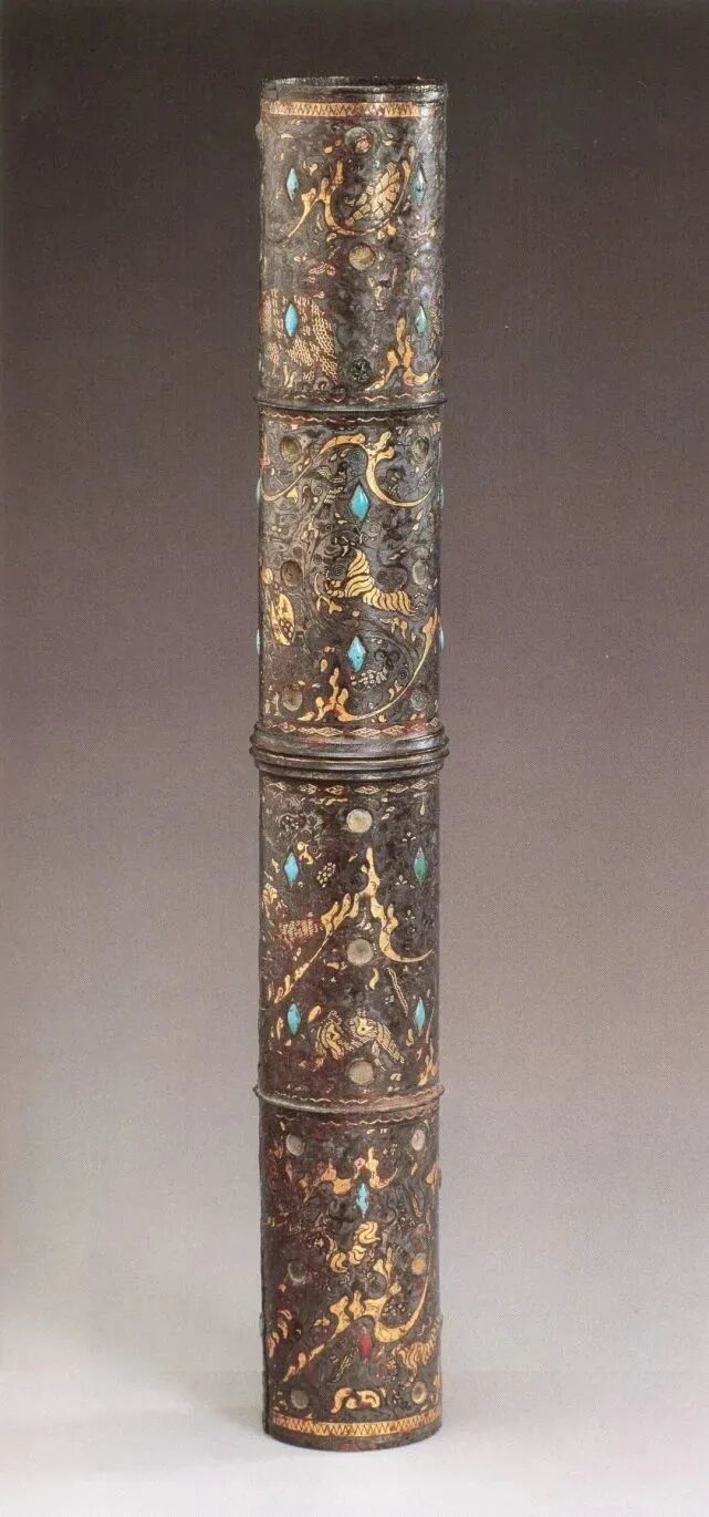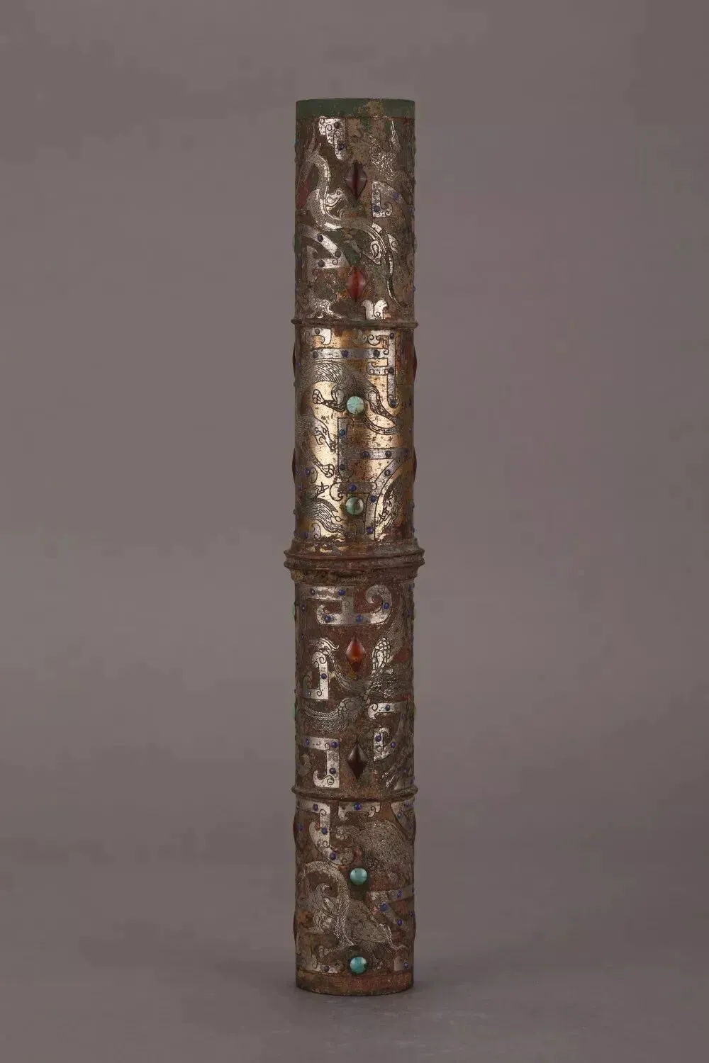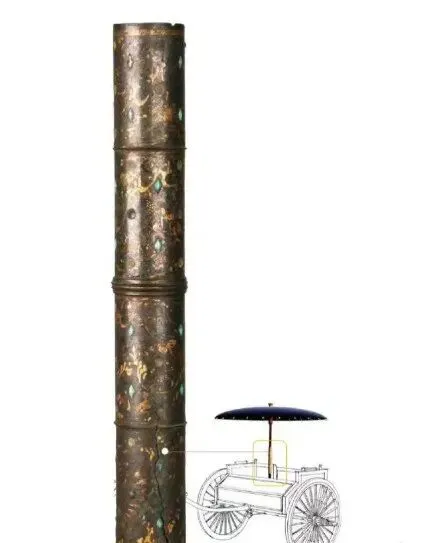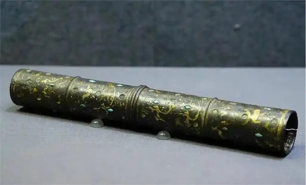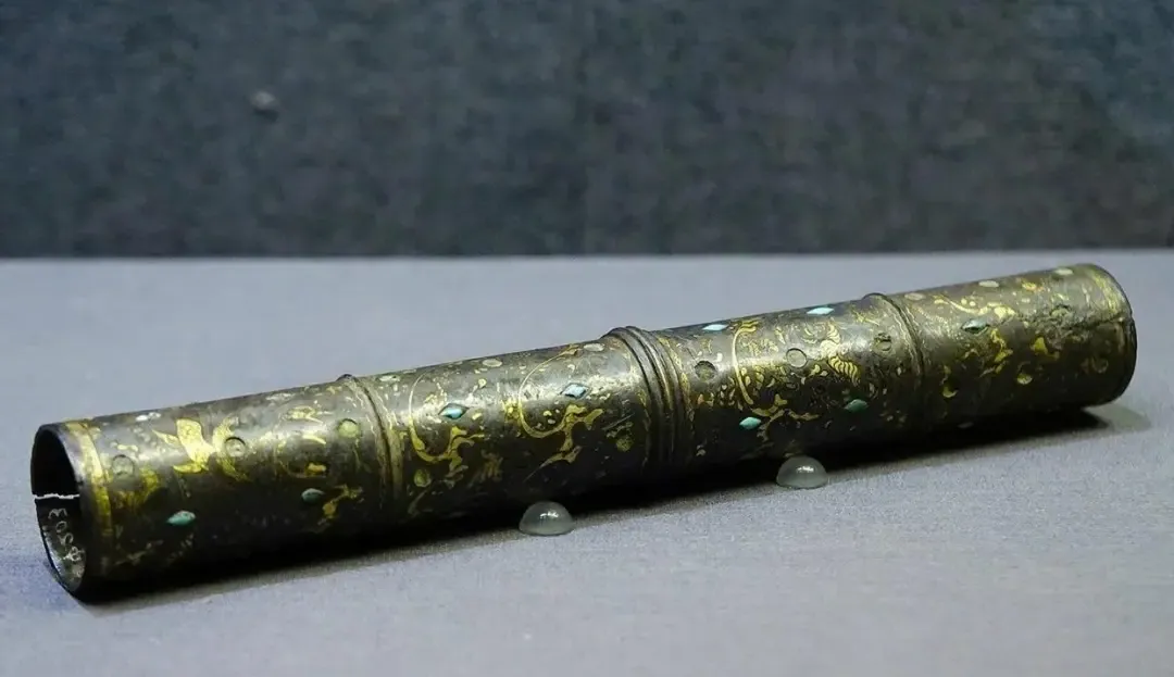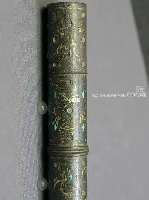 No163:西汉错金银镶松石狩猎纹铜伞铤