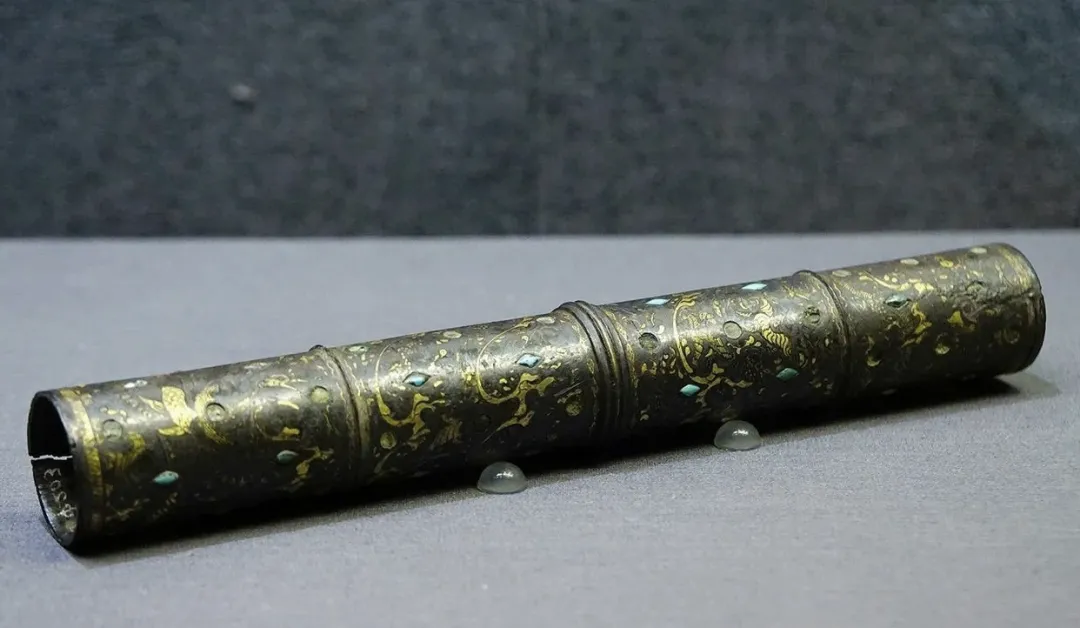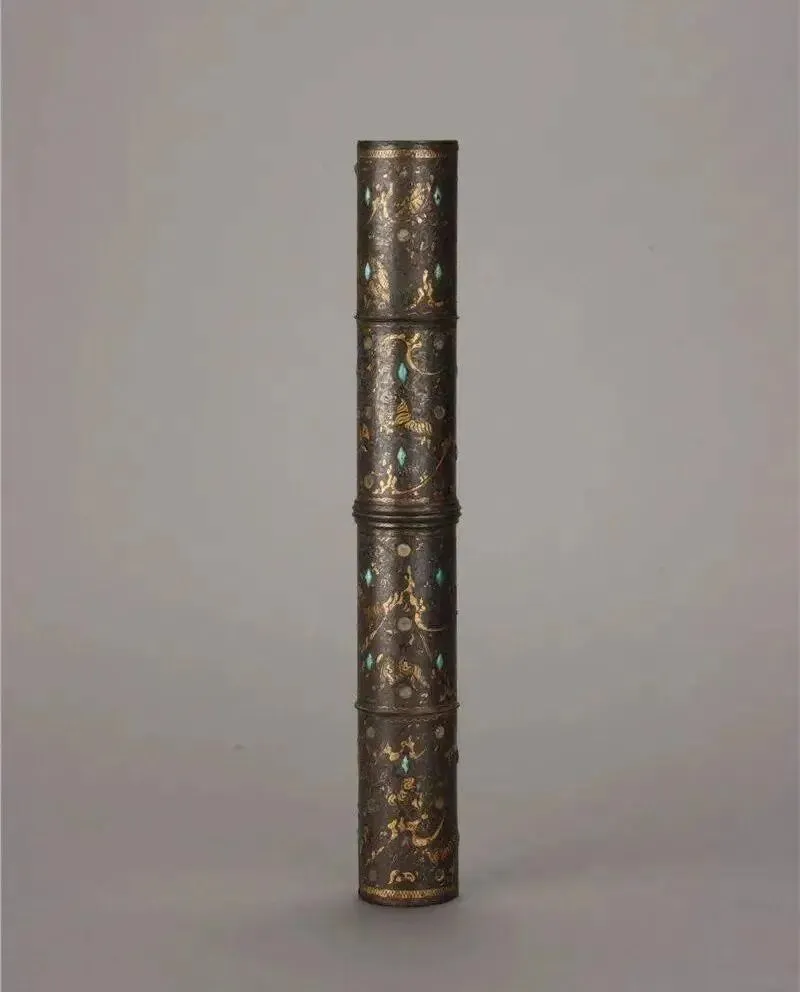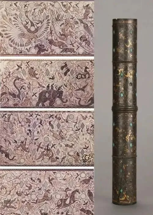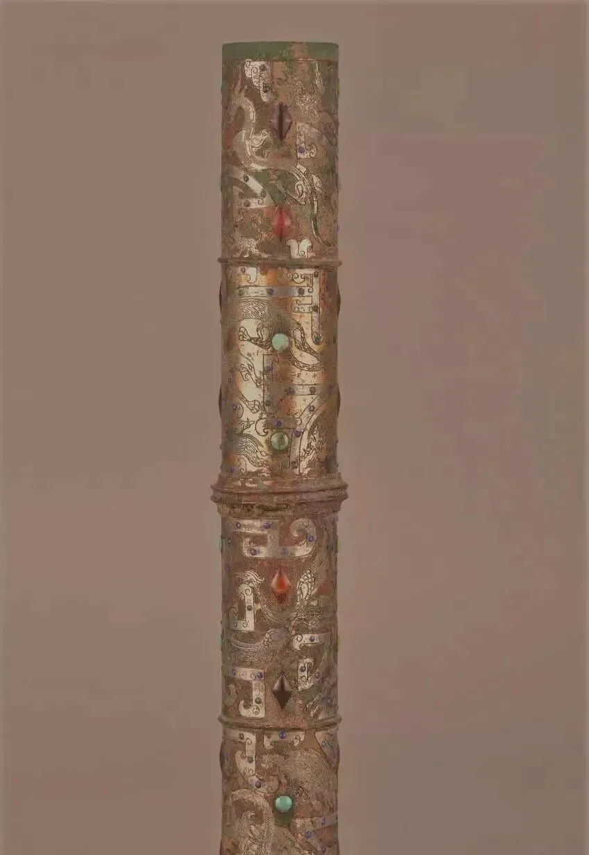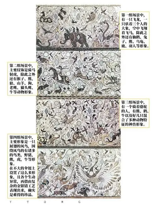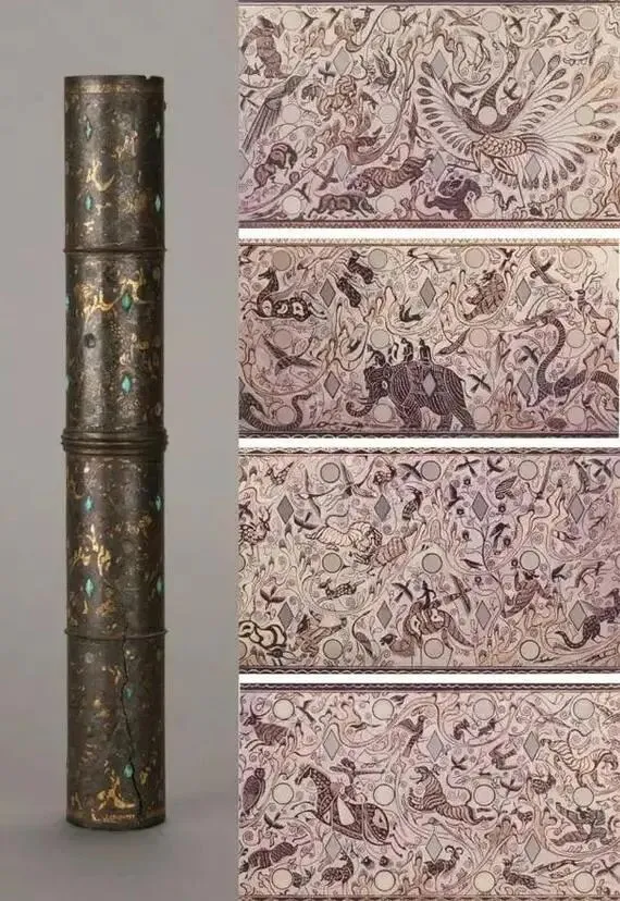 西汉错金银镶松石狩猎纹铜伞铤的四段纹饰各具主题,以精湛的错金银工艺在圆筒形器身上描绘出一幅融合现实狩猎与神话升仙的连续画卷。