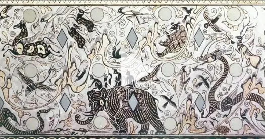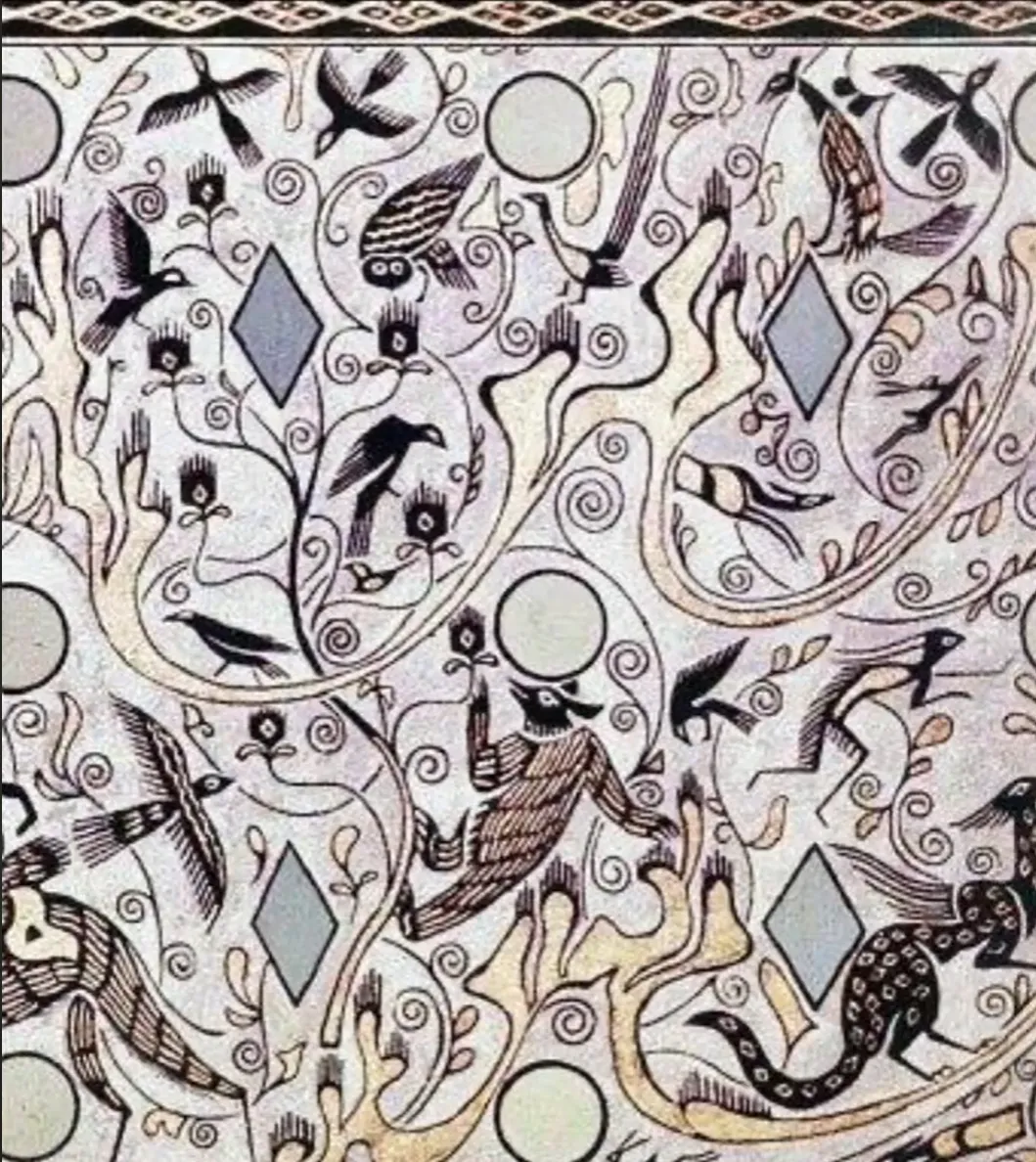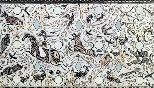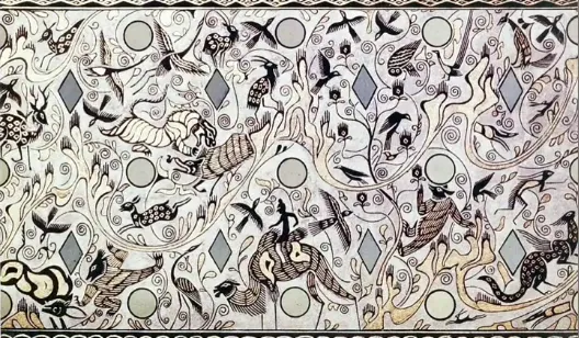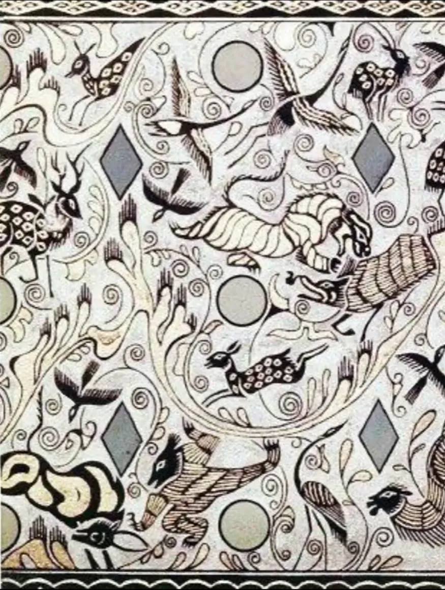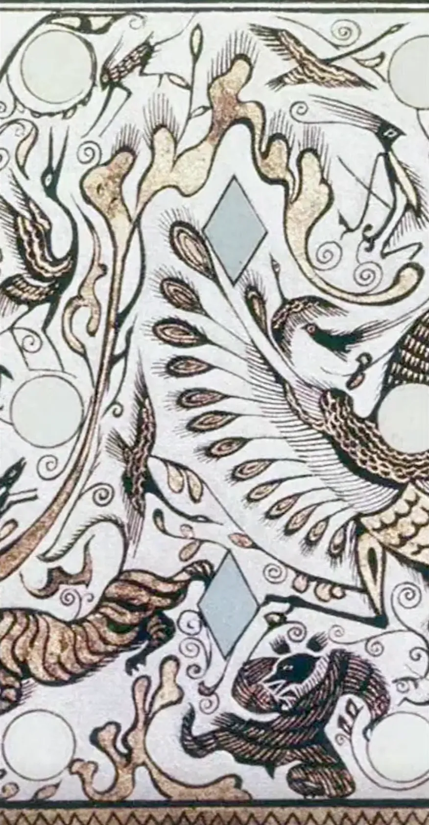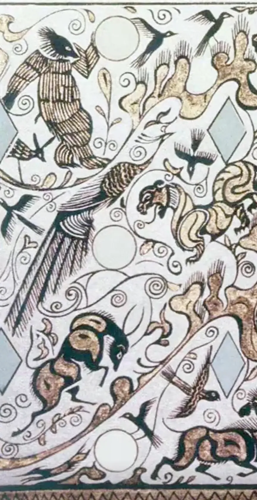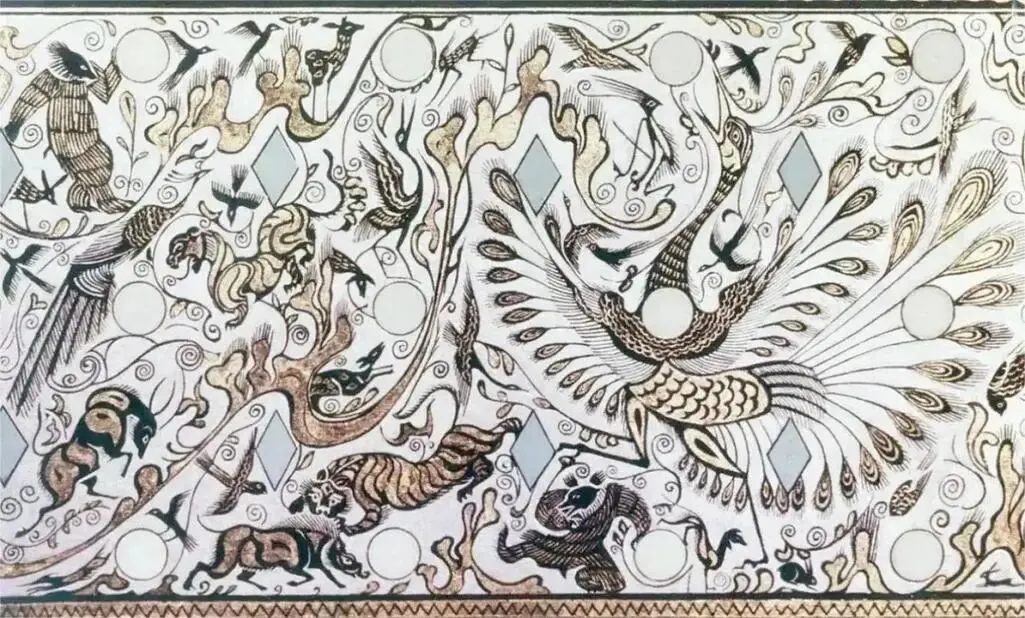 第四段以孔雀开屏、引颈长鸣为主角,周围群鸟纷飞,虎捕牛、熊鹿猴鹤穿梭其间,画面华美祥瑞,象征自然和谐与生命繁盛。四段纹饰虽主题各异,但通过起伏山峦与连续曲线串联,构成一幅既富神话色彩又源于现实生活的艺术长卷。