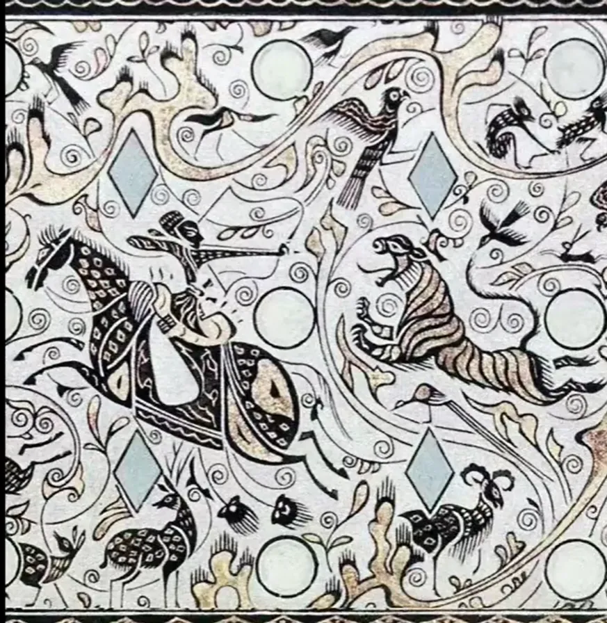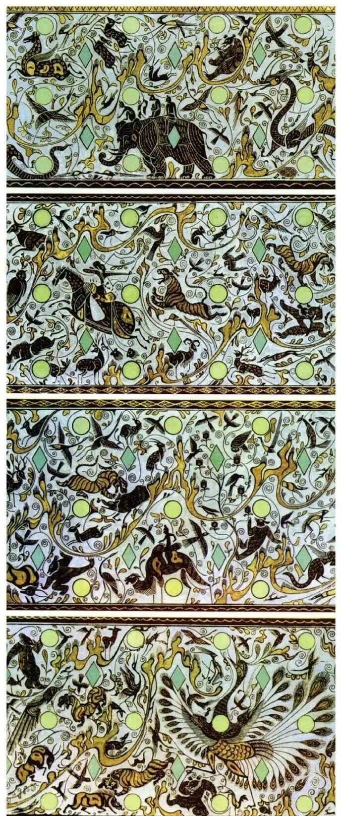 第二段主题为骑士反身引弓射虎,描绘山林间猛兽出没,骑士勇武狩猎,周围有熊、鹿、羚羊、野牛与飞鸟环绕,写实生动,体现贵族畋猎生活;