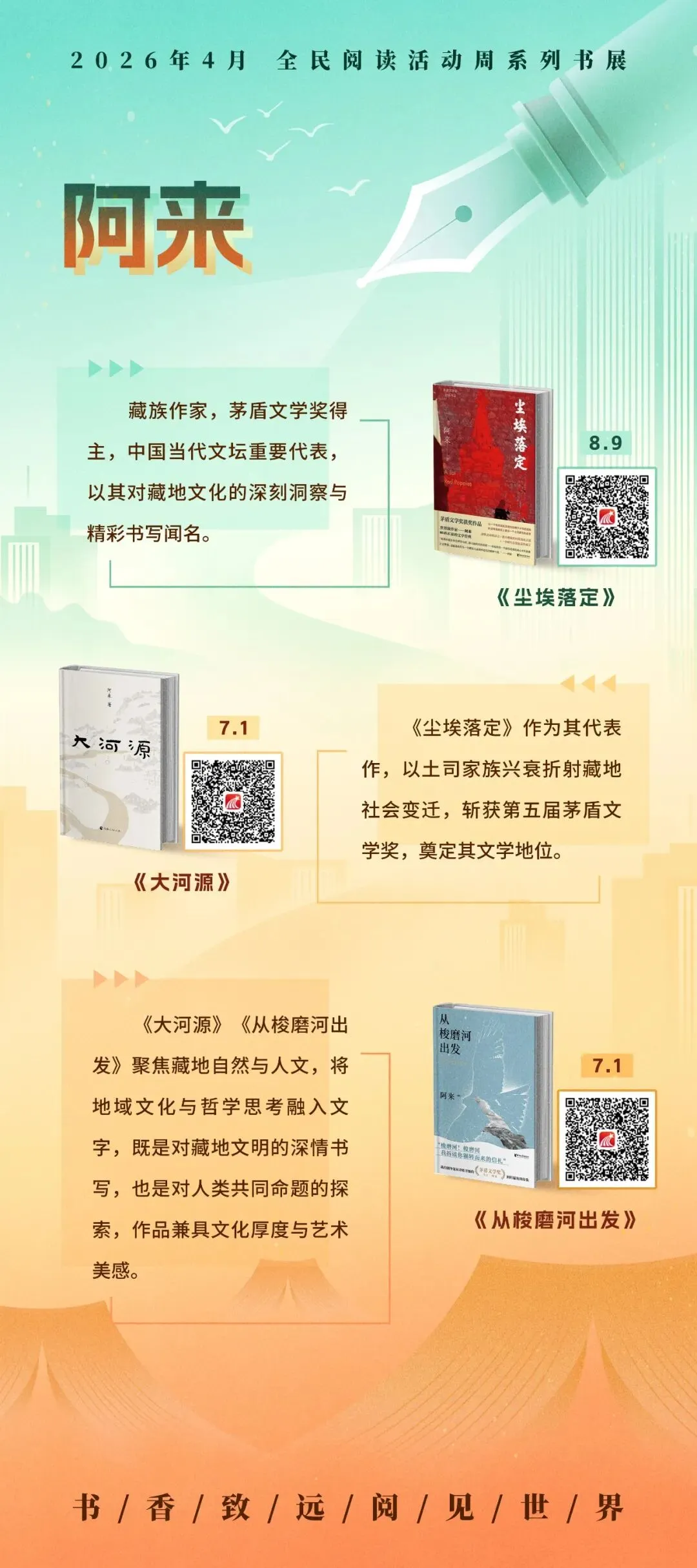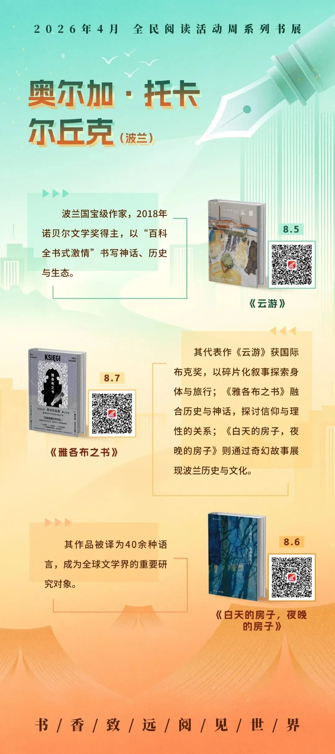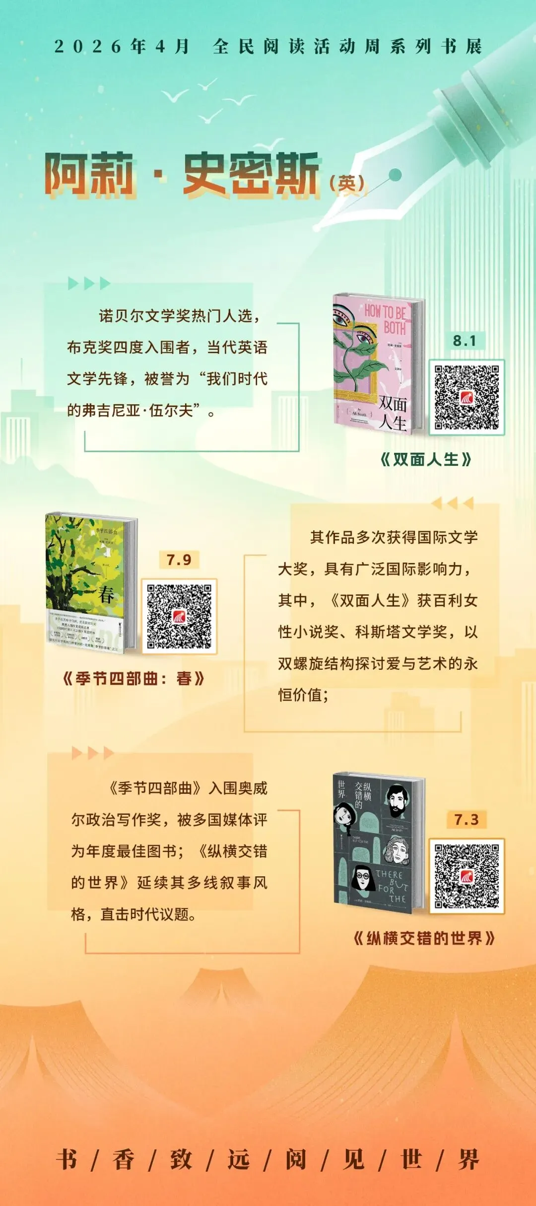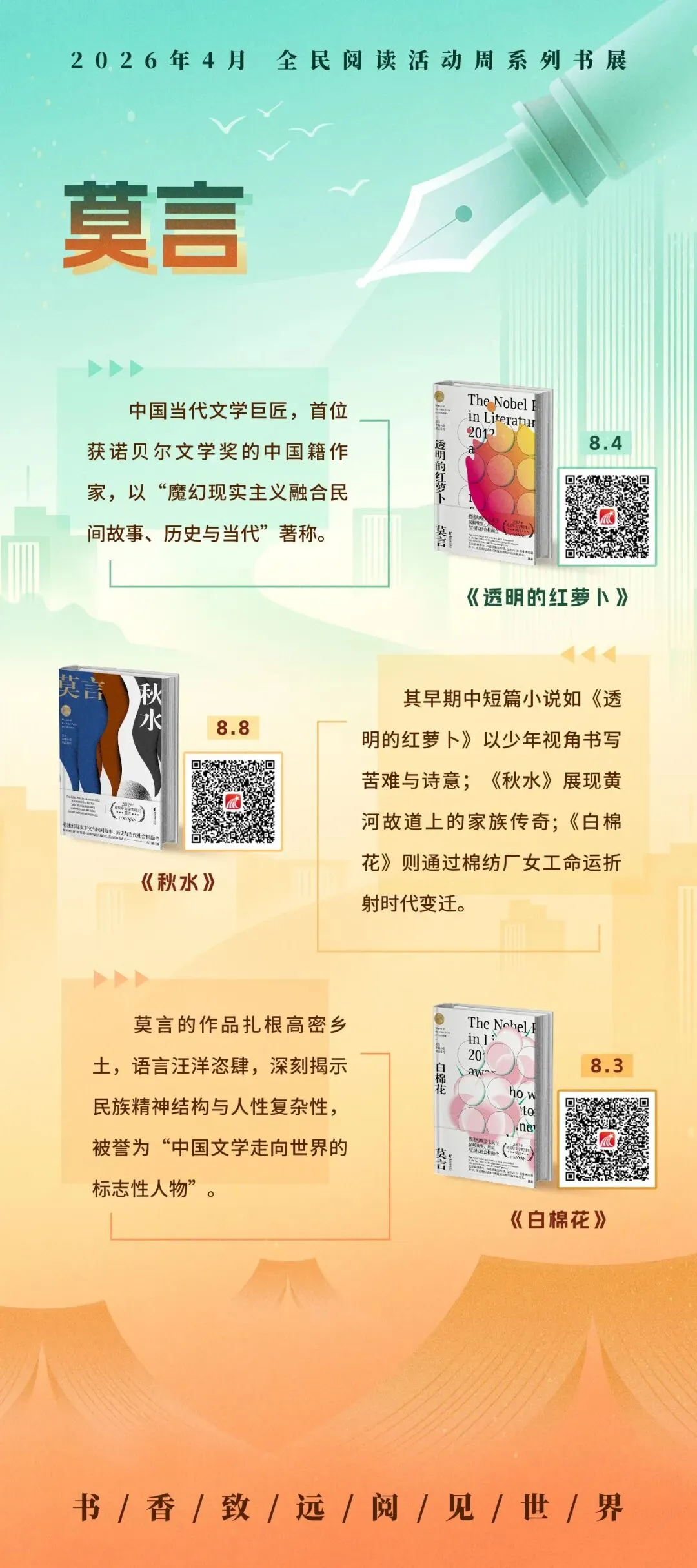 循着名家的足迹,超星2026年4月全民阅读活动周系列书展之“文坛群星·时代华章”主题展,以十余幅展图,邀您走近莫言、阿来、蔡崇达、阿莉·史密斯、奥尔加·托卡尔丘克等十位中外作家。诚邀您开启这场阅读之旅,与这些照亮时代的文坛群星相遇,在他们的文字里照见时代,也照见自己。