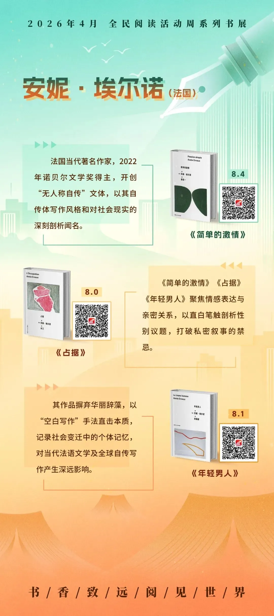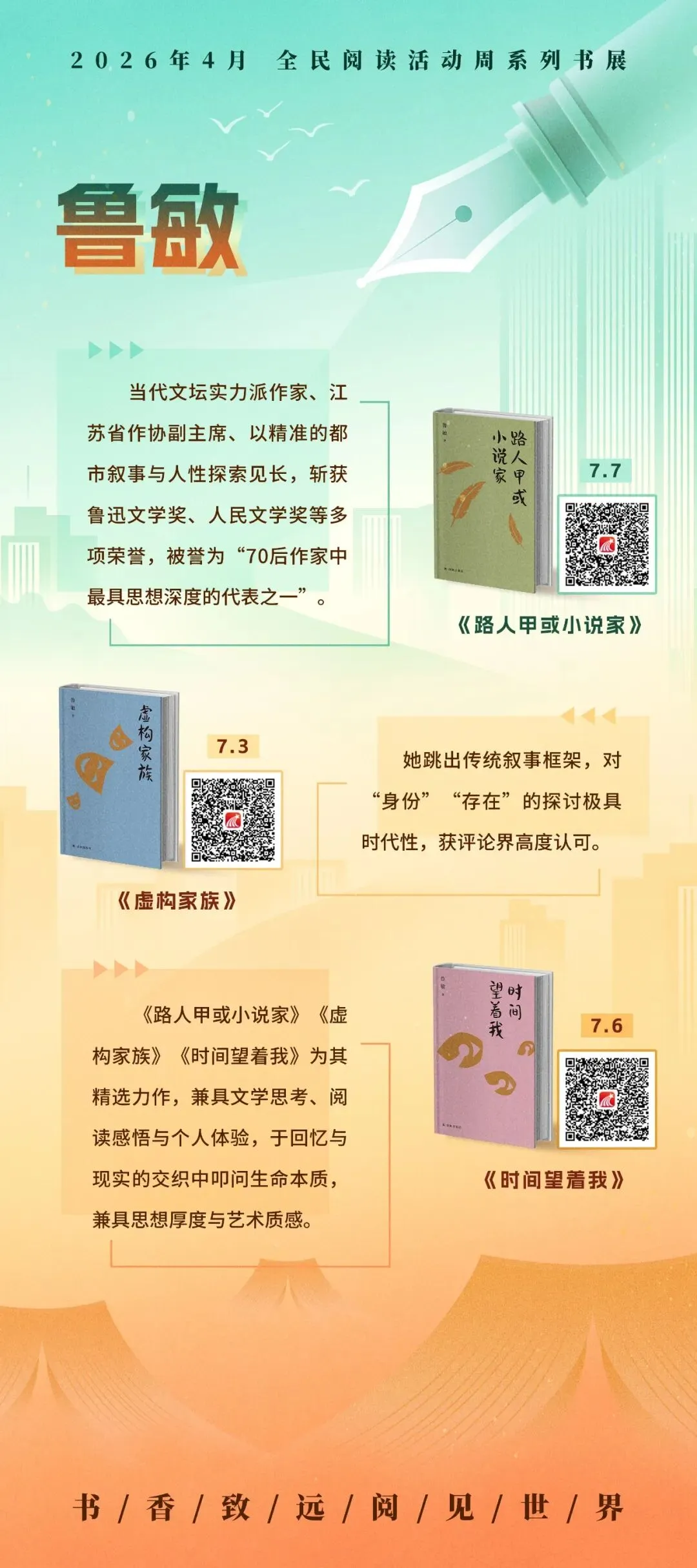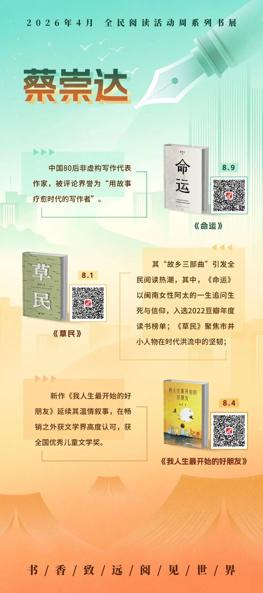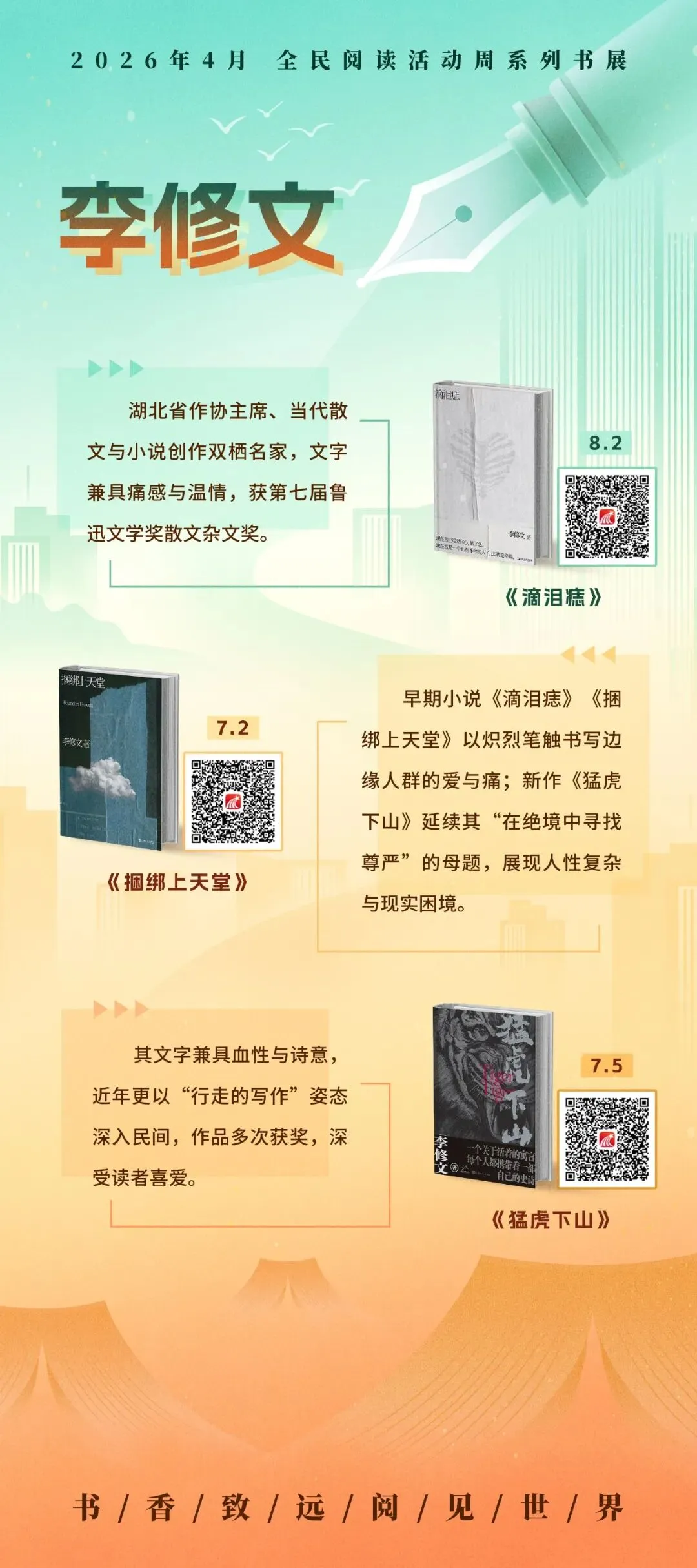 循着名家的足迹,超星2026年4月全民阅读活动周系列书展之“文坛群星·时代华章”主题展,以十余幅展图,邀您走近莫言、阿来、蔡崇达、阿莉·史密斯、奥尔加·托卡尔丘克等十位中外作家。诚邀您开启这场阅读之旅,与这些照亮时代的文坛群星相遇,在他们的文字里照见时代,也照见自己。