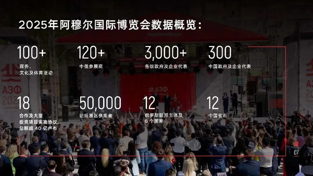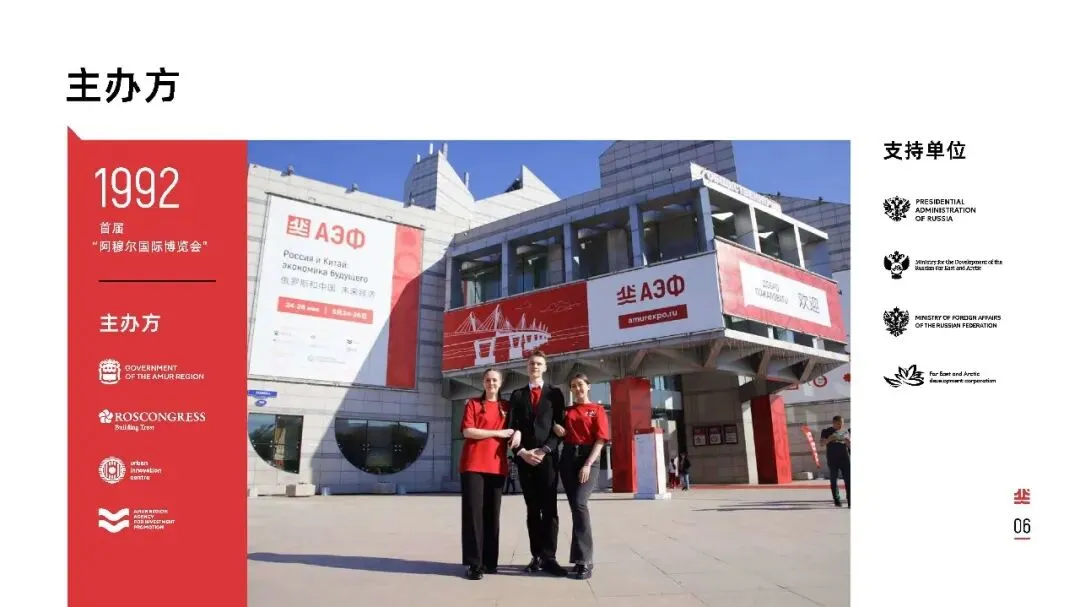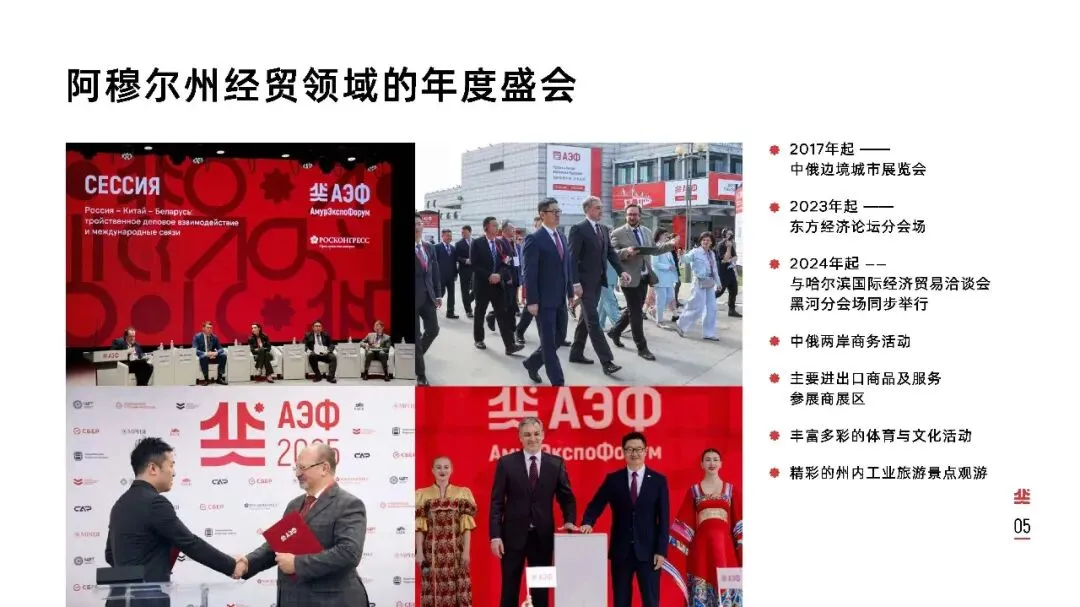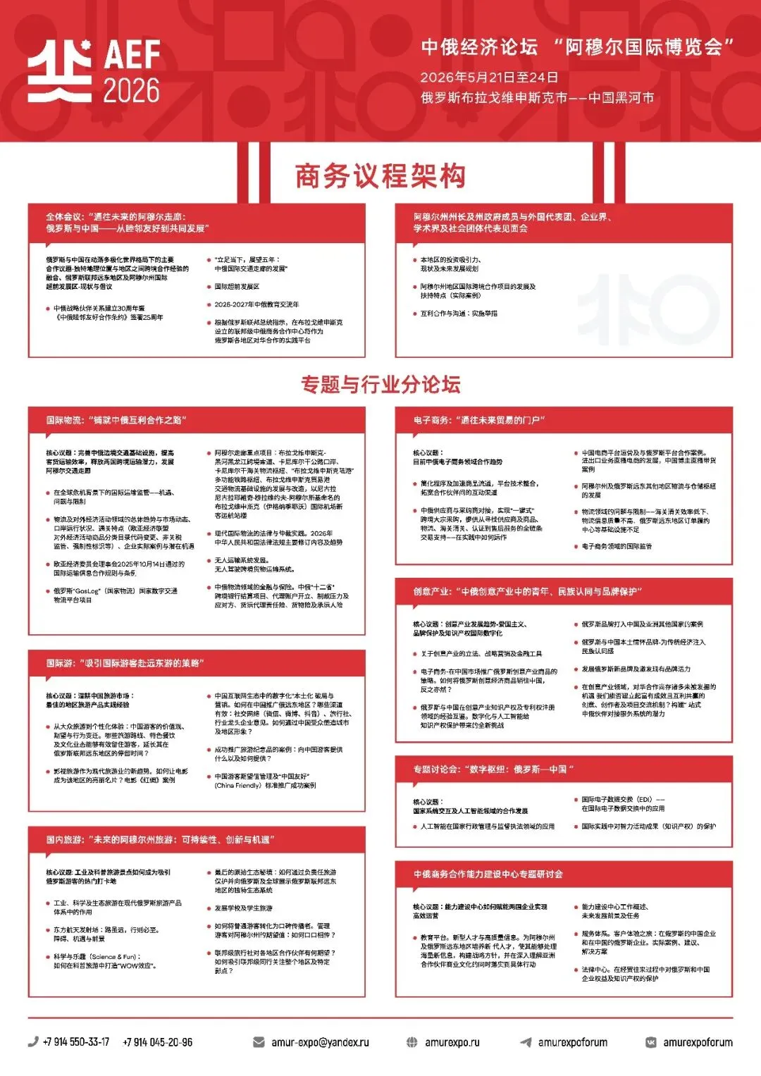 邀请中国有关单位和企业家参加“阿穆尔博览会”经济论坛(2026 年 5 月21-24 日) 。“阿穆尔博览会”已连续第三年与俄罗斯会展基金会合作举办,并成为东方经济论坛的场外会场。重要的是,论坛部分活动同时在中国(黑河市)和俄罗斯(布拉戈维申斯克市)两国举行。