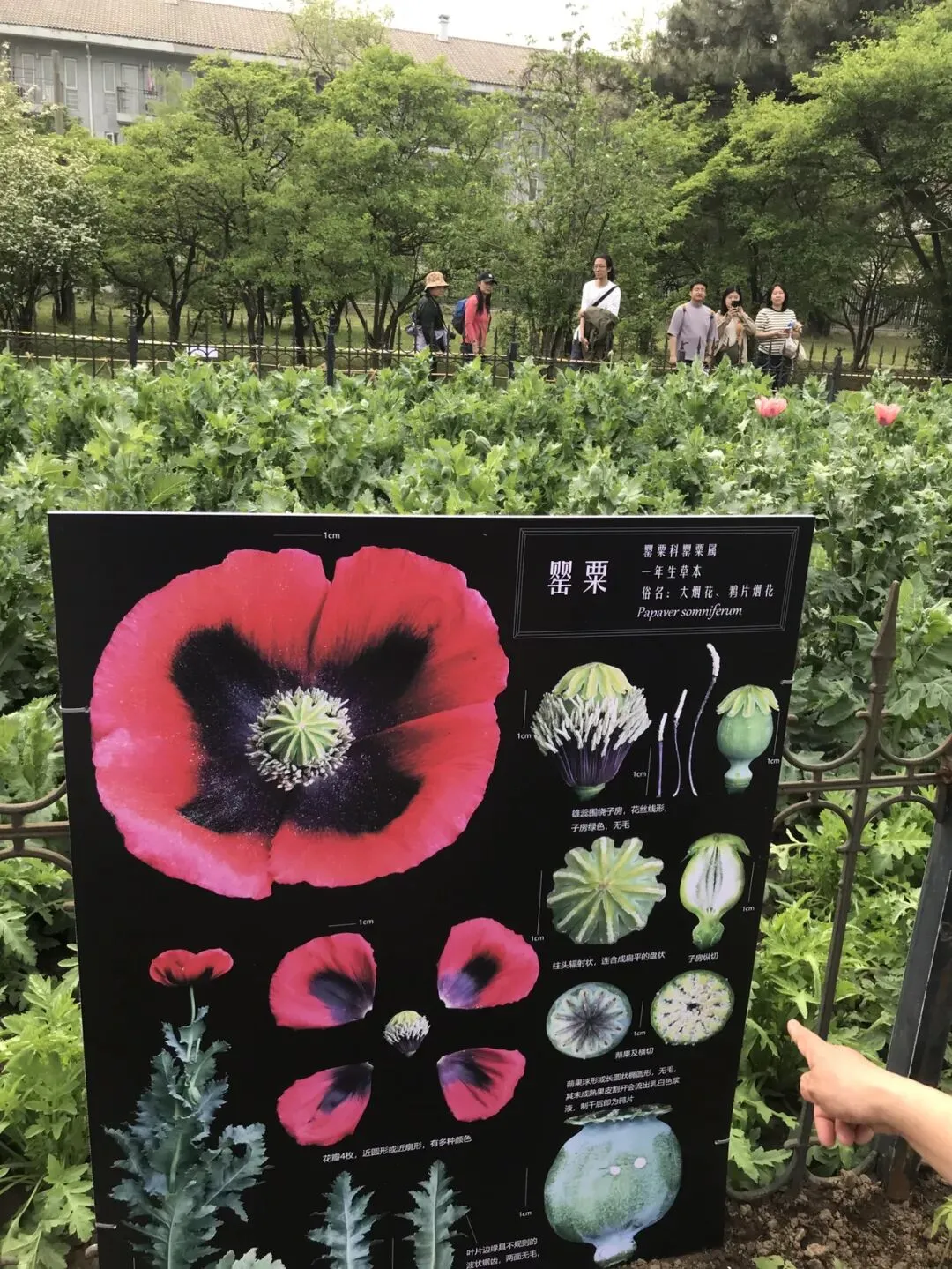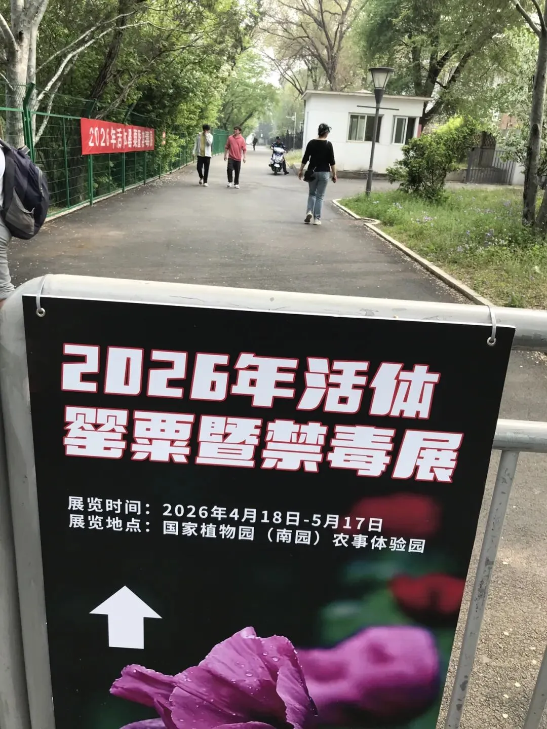 昨天,2026年4月18日,星期六上午,我们去香山国家植物园南园看牡丹。进大门的时候,意外发现国家植物园与公安禁毒部门联合举办活体罂粟与禁毒展览的海报,恰好是开展第一天。真是来得早不如来得巧,当场决定先去看“久仰大名”的罂粟!
