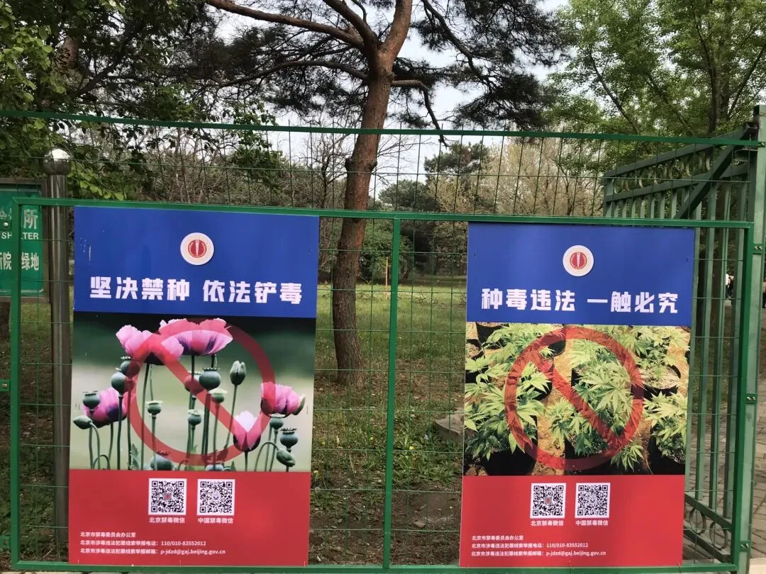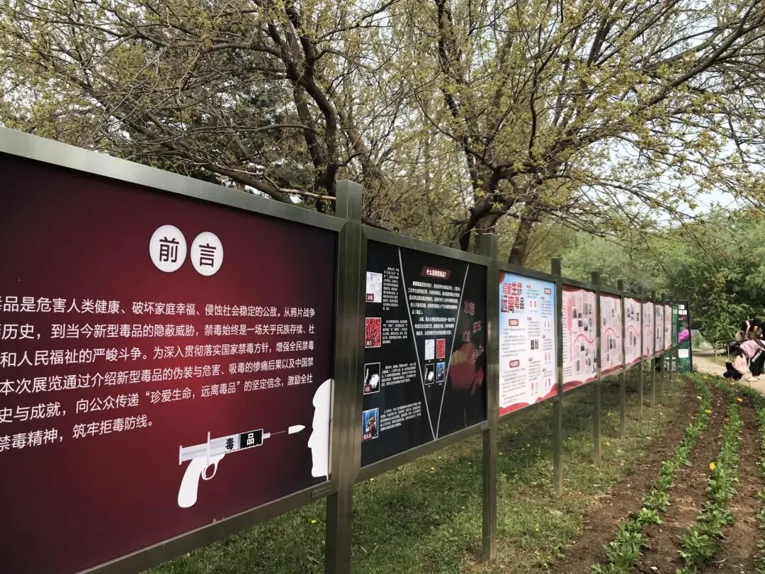 进入展览区域,路边是刚刚树立的展板,讲述各种毒品的危害,图文并茂。展板脚下就是刚种上的一种罂粟。