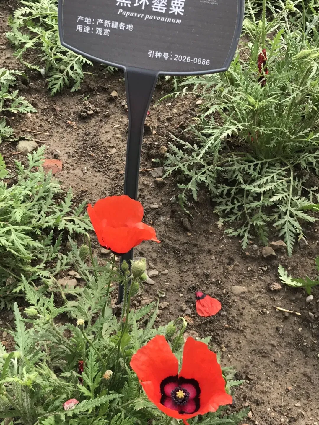 漂亮的花朵越来越像罂粟了。这叫黑环罂粟,产地是新疆。观赏植物,仍然无毒。请大家注意,小标牌上专门标着“引种号:2026-0886”,这是植物园别的任何花木都没有的。说明禁毒展览的所有植物,都受到了相关部门的严密监督。我注意到禁毒展览海报上强调了展览过程中专门有公安民警现场讲解,展览结束时由民警监督当场销毁种植物。