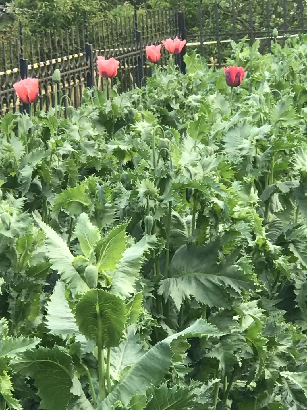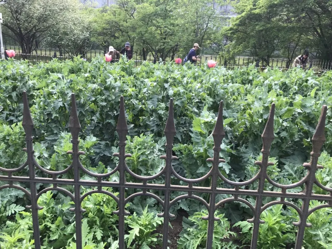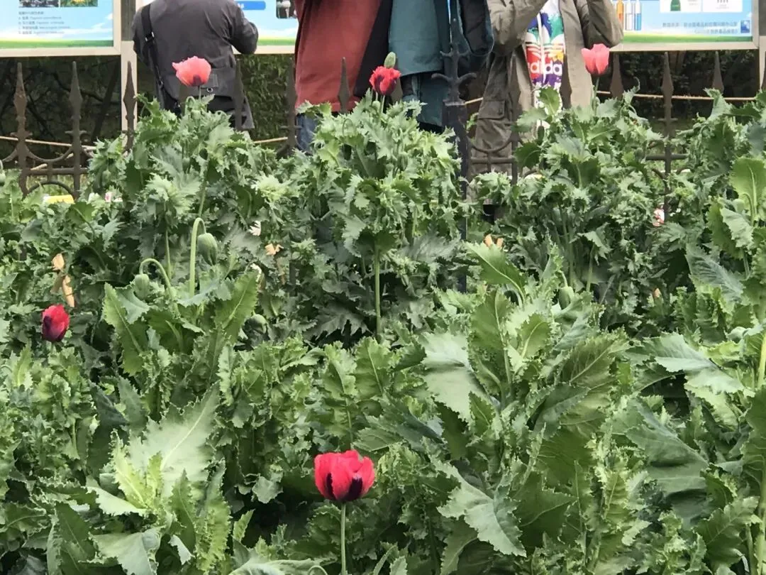心急的读者可能抱怨我啰嗦了这么多还没有说到主题上。好吧,终于到了大家还有我自己都最想看的主角罂粟了。罂粟被围在展览区最里头的一圈高高铁尖栅栏里面。首先让我惊讶的是罂粟长得又高又壮,一米多高,比罂粟科的其它花草虞美人之类都高。