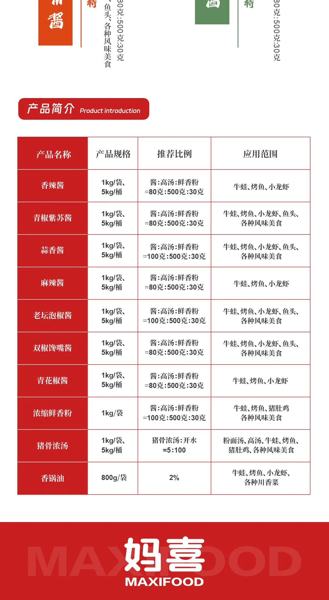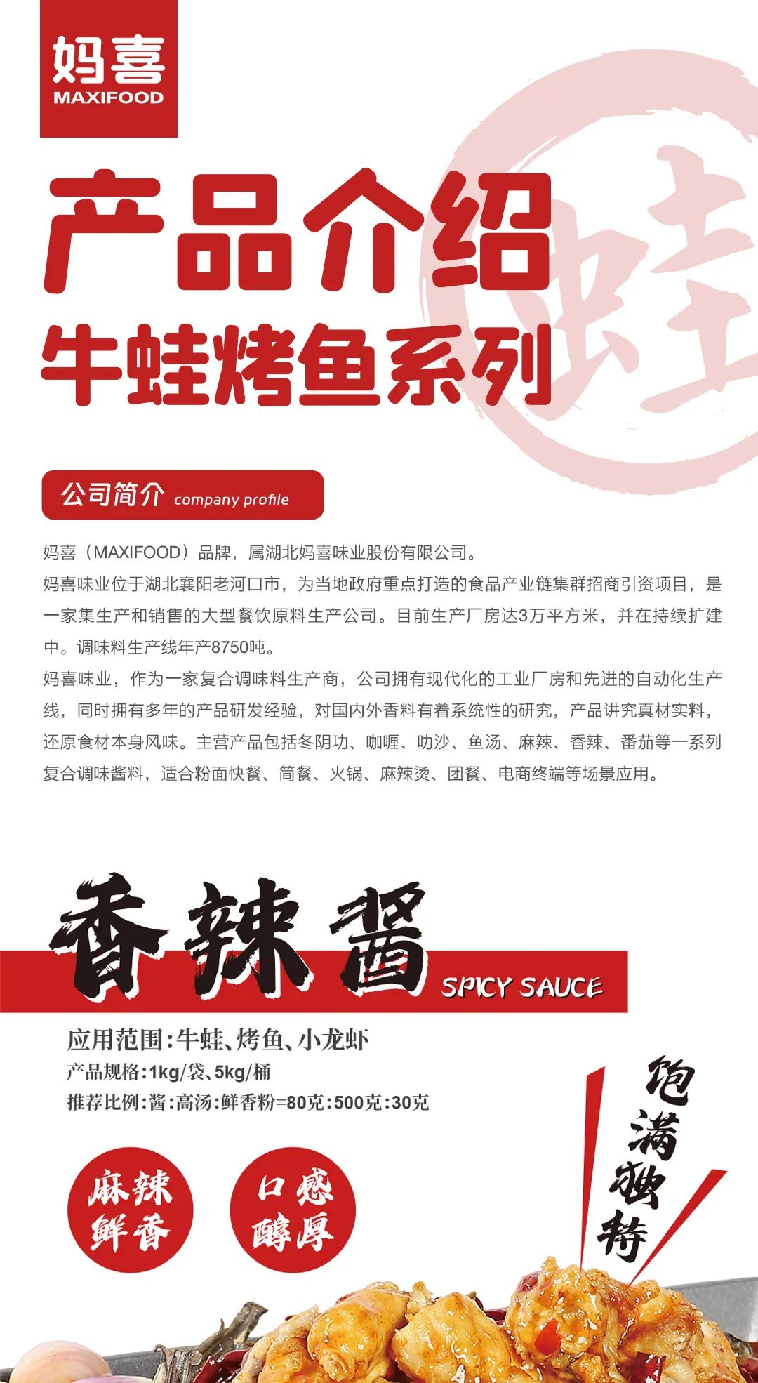妈喜味业,作为一家复合调味料生产商,公司拥有现代化的工业厂房和先进的自动化生产线,同时拥有多年的产品研发经验,对国内外香料有着系统性的研究,产品讲究真材实料,还原食材本身风味。主营产品包括冬阴功、咖喱、叻沙、鱼汤、麻辣、香辣、番茄等一系列复合调味酱料,适合粉面快餐、烤鱼、牛蛙、简餐、火锅、麻辣烫、团餐、电商终端等场景应用。
