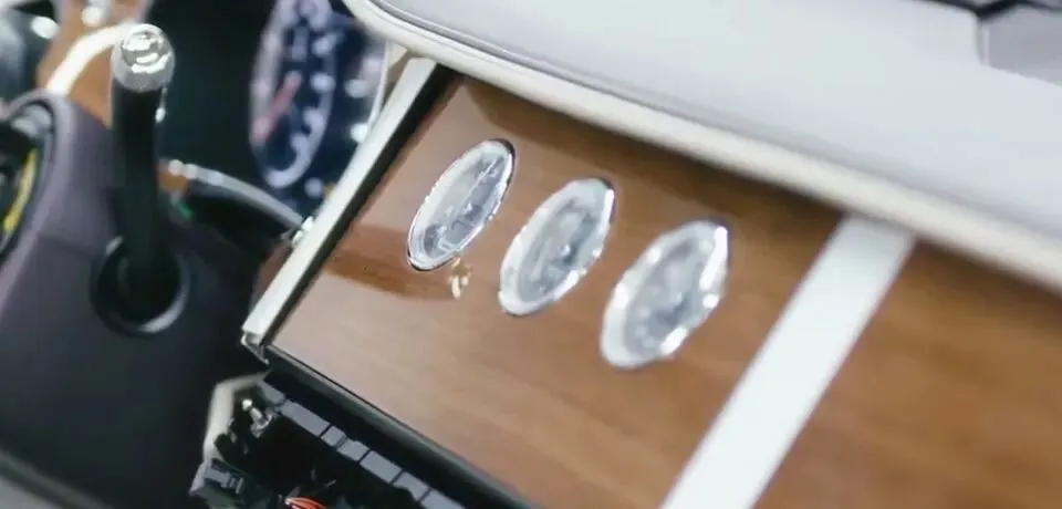 再看看成品的座舱,那三连仪表设计,配上顶级的木纹和真皮,这个质感是真的拉满。