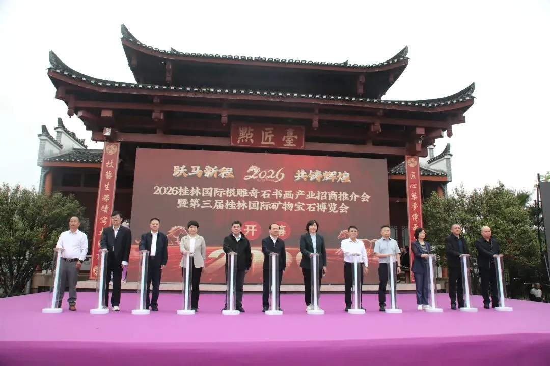 4月16日,2026年桂林国际根雕奇石书画产业招商推介会在象山区瓦窑小镇启幕,来自巴基斯坦及全国各地的参展商、藏家、企业家代表200余人参加活动。市委常委、统战部部长赵奇玲出席并宣布大会开幕。市政协副主席、象山区委书记莫振华致辞。自治区党委统战部非公经济工作处处长唐臻文,桂林市委统战部副部长、市工商联党组书记潘德辉,桂林市文联主席何绍连,象山区人民政府区长蒋玲荣,象山区人大常委会主任经翠艳,象山区政协主席潘波平,中国古生物化石保护基金会副理事长陆建华等领导出席活动。
