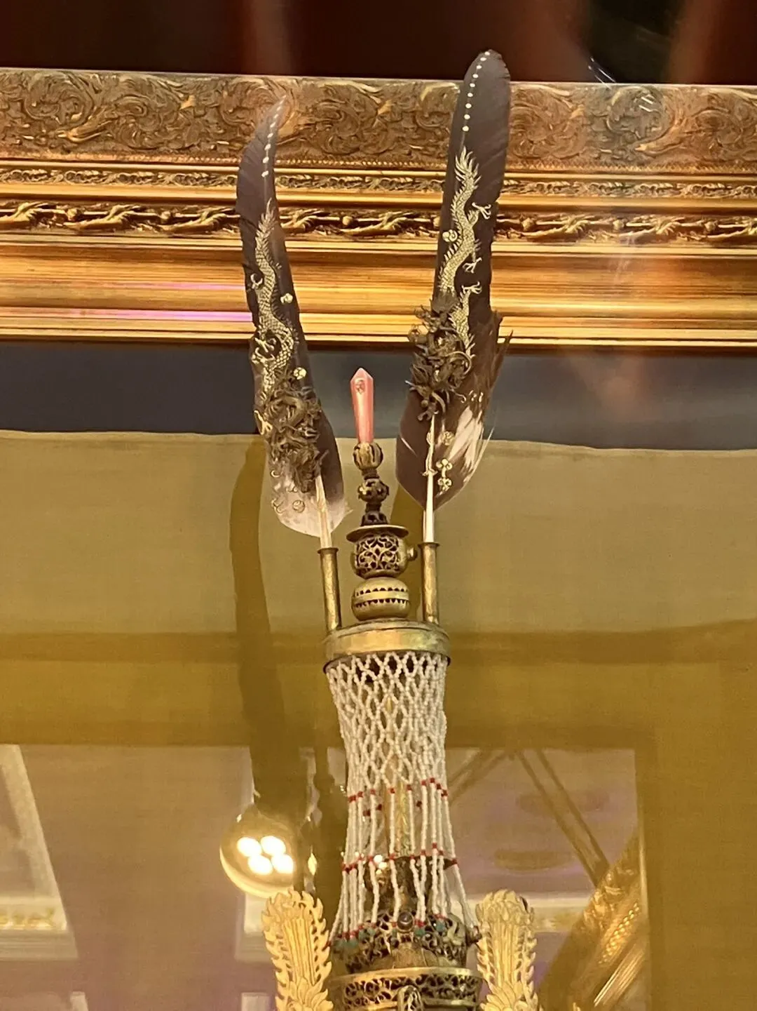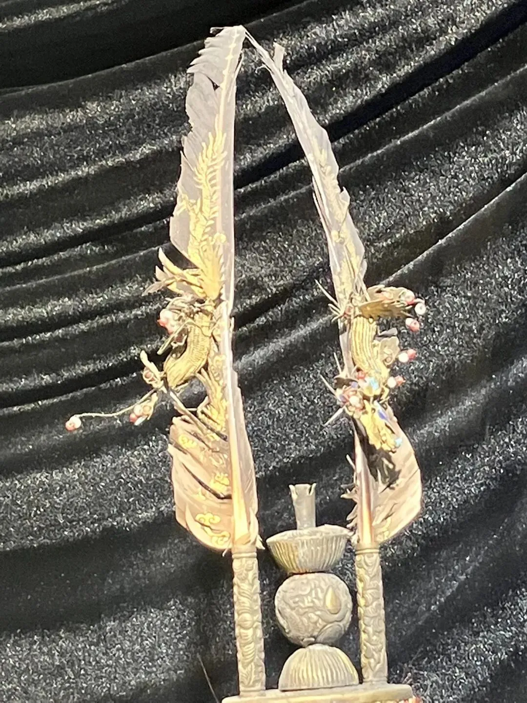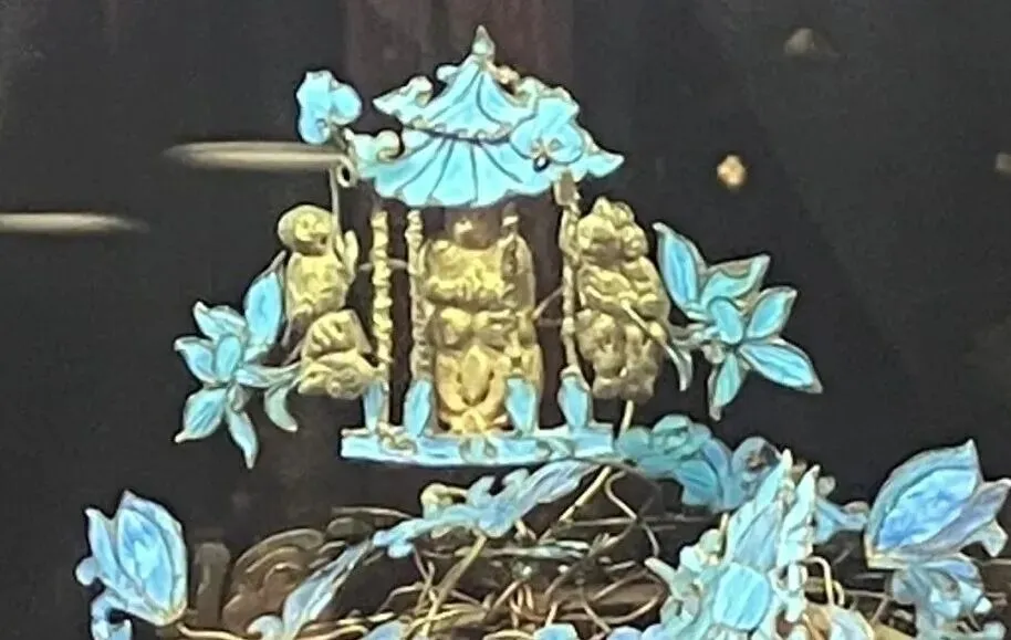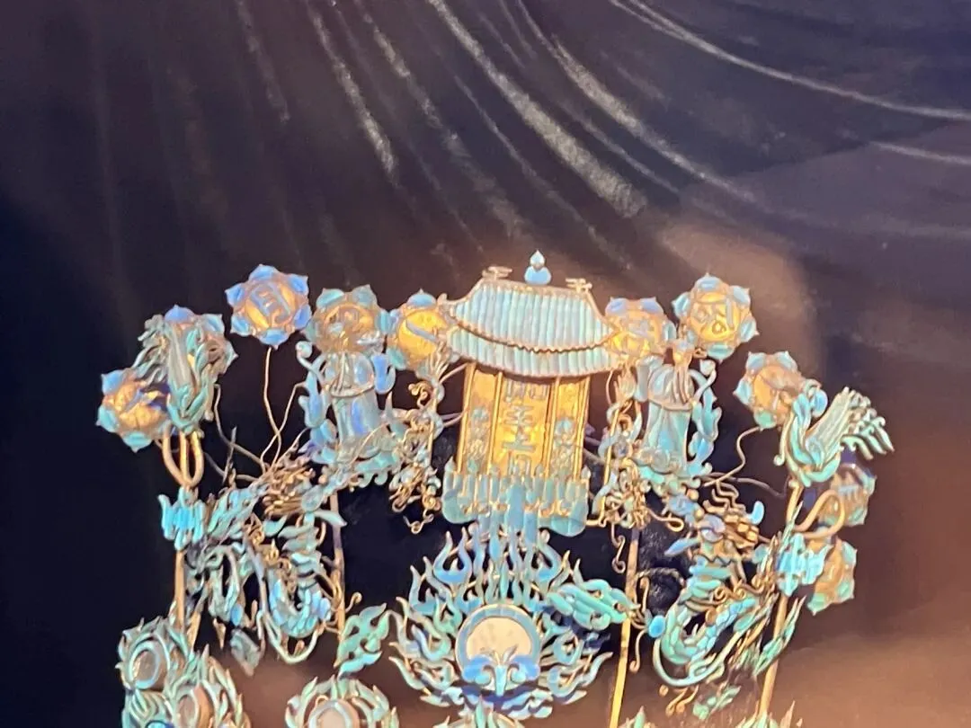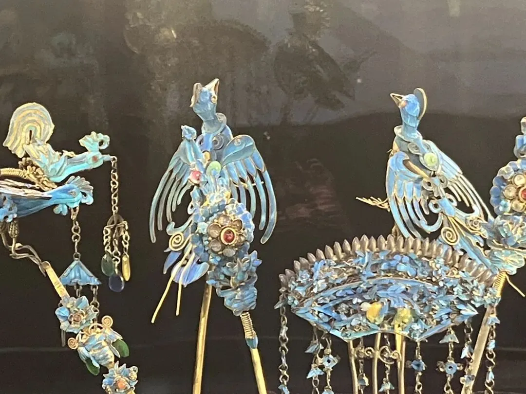 不知道是制作太久还是光不够亮,没觉得点翠首饰好看,乍看就像蓝色纸板。甚至在看到文字介绍前,都没发现是羽毛,因为一根根细丝已经黏在一起