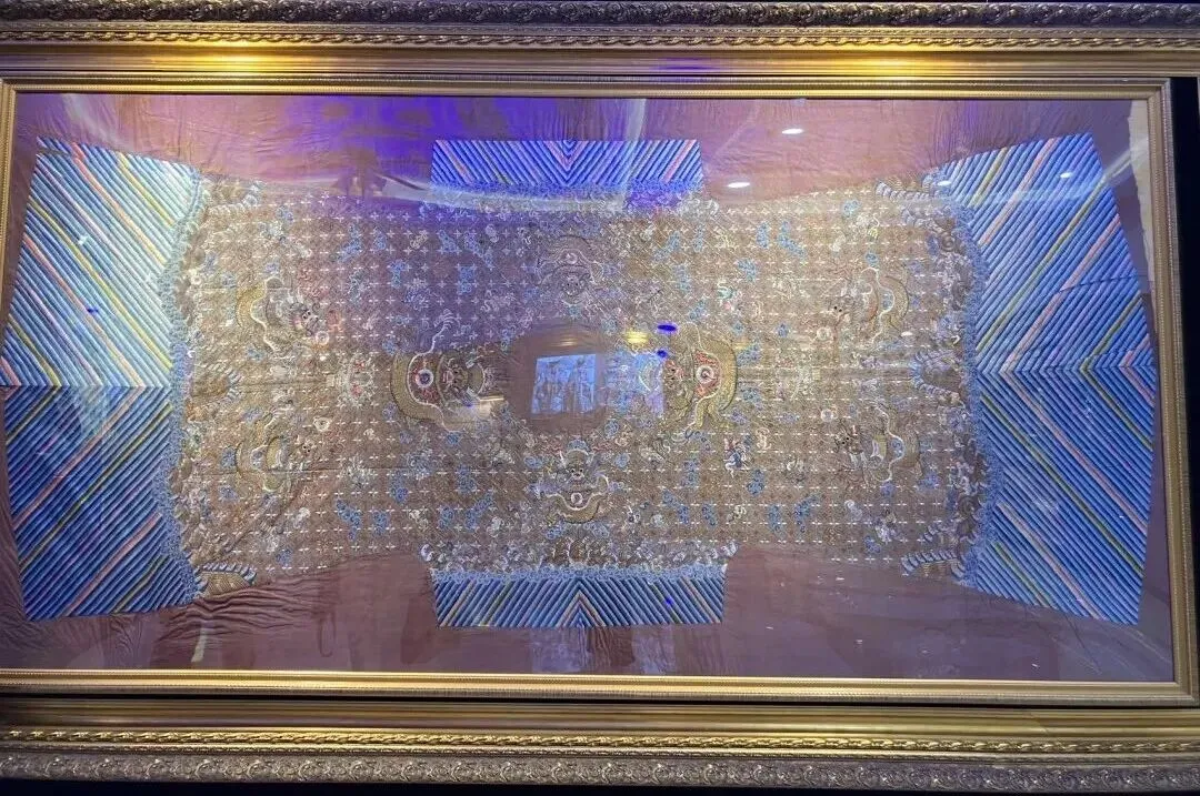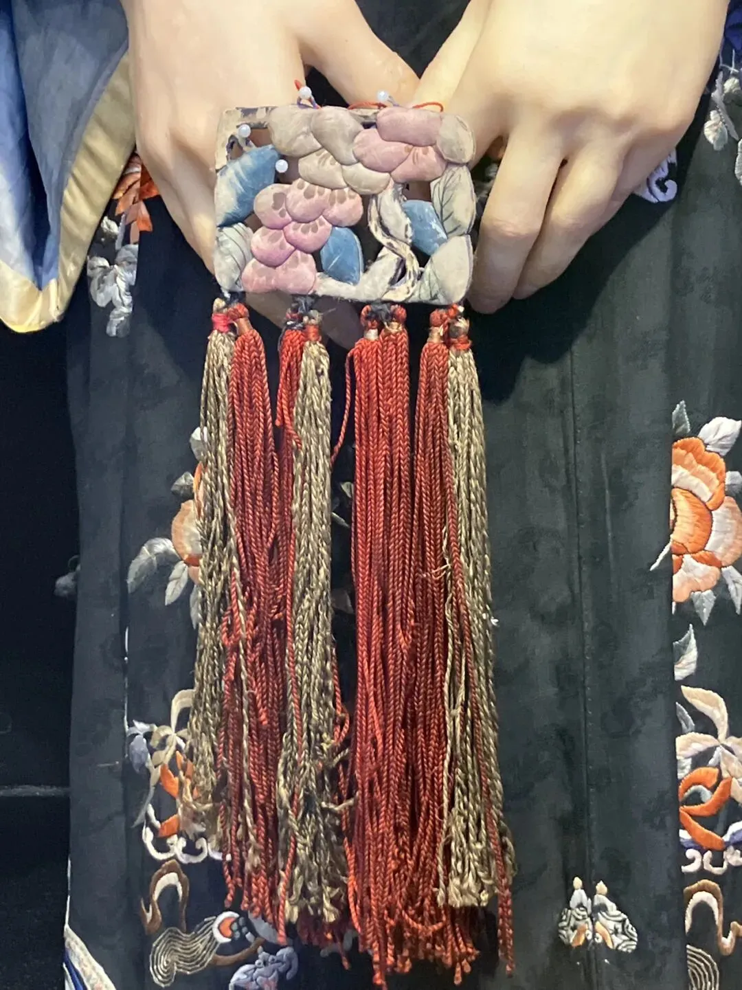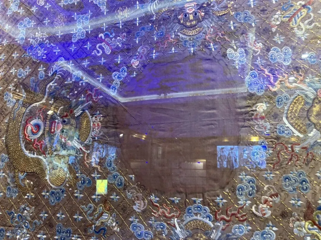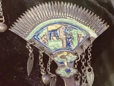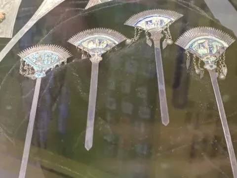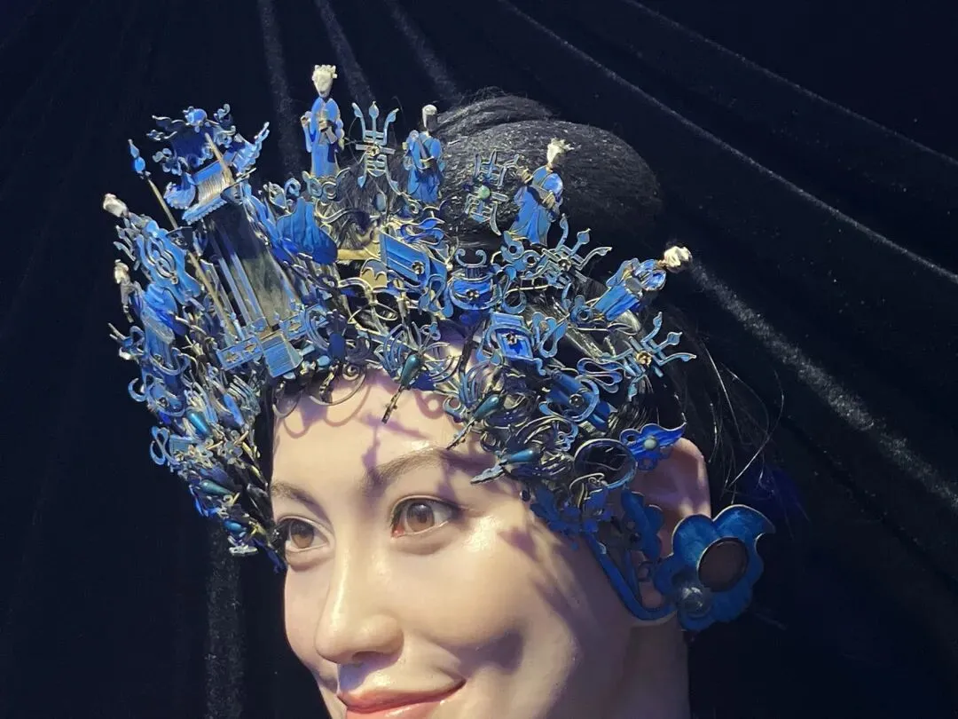 不知道是制作太久还是光不够亮,没觉得点翠首饰好看,乍看就像蓝色纸板。甚至在看到文字介绍前,都没发现是羽毛,因为一根根细丝已经黏在一起