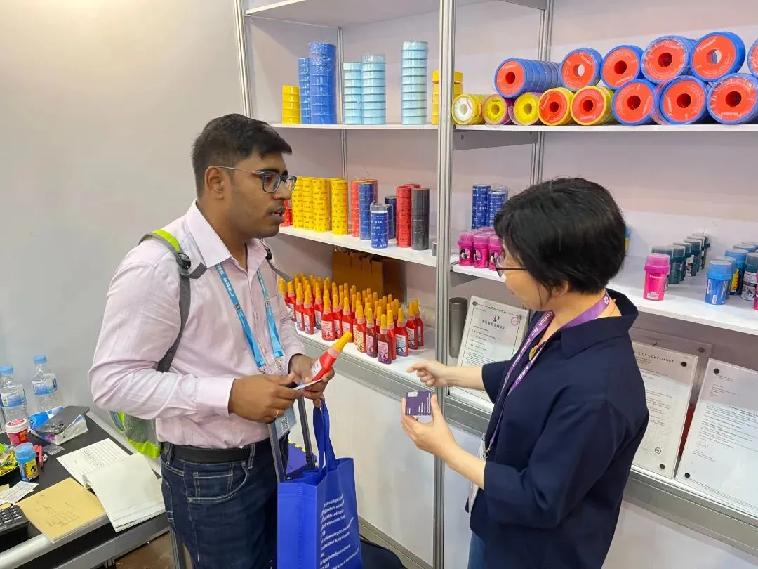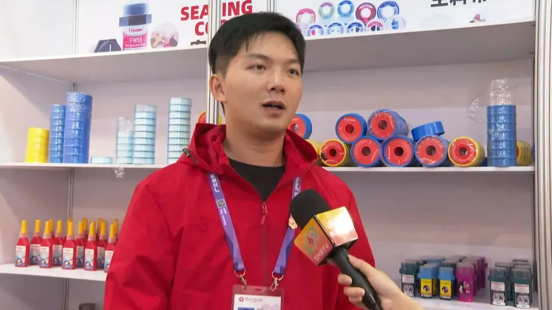 今年广交会的整体氛围非常热烈,大家采购的意向是非常强的,我们接待的效率也很高。像这一款我们自己研发的专利产品,它的特点就在于密封性能好,它是由一条尼龙线加上我们自己研发的这种浆体组成的,它的使用场景非常广阔,它是能密封燃气,也能密封水,密封性能相比于其他的产品是更加好的。