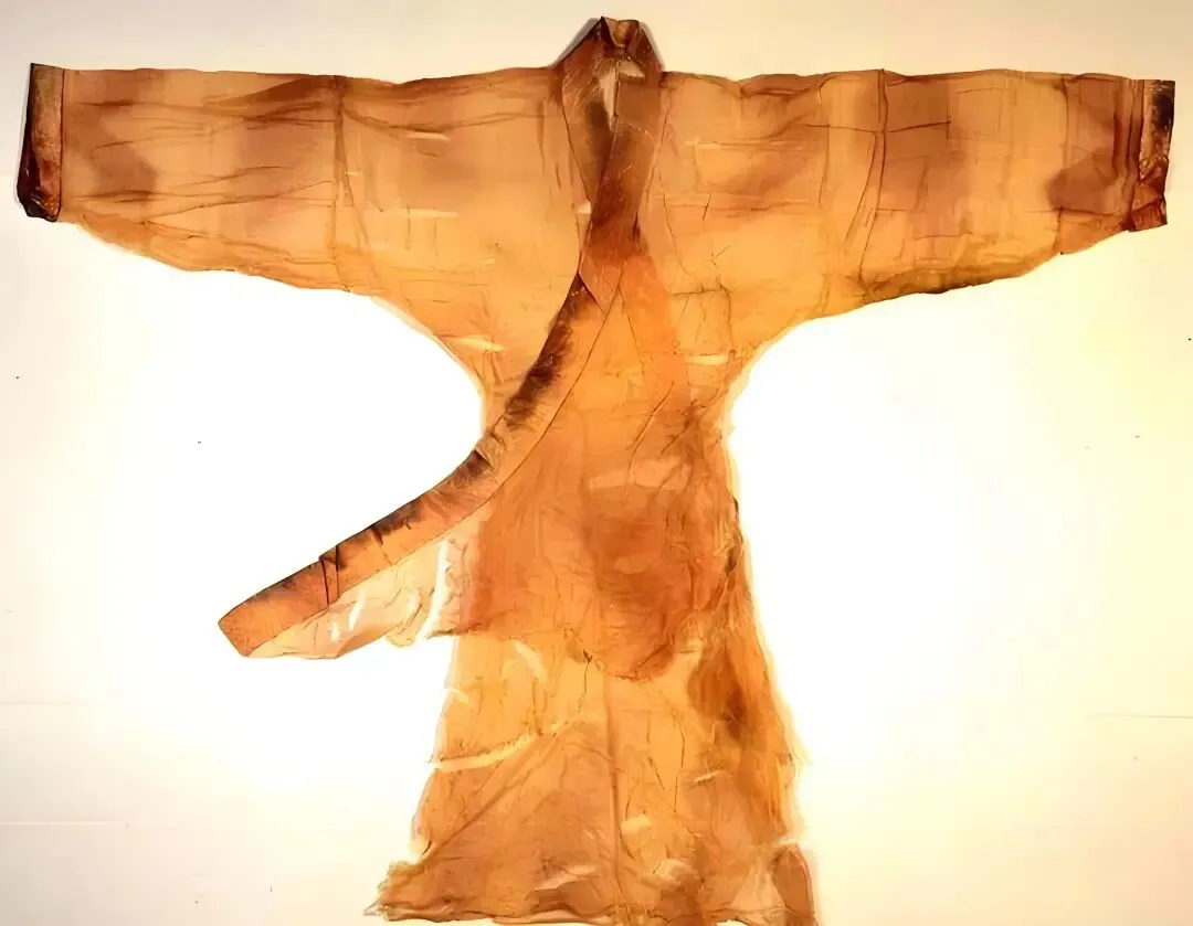 1972年在湖南长沙马王堆一号墓出土。由精缫的蚕丝织造,丝缕极细,轻盈精湛,孔眼均匀清晰,通身重量仅为49克,除去袖口和领口部分,重量仅有25克左右,可谓轻若烟雾,薄如蝉翼。整件衣服以素纱为面料,没有衬里,没有颜色,所以出土的时候称之为素纱襌衣。西汉直裾素纱襌衣高超的制作技艺代表了西汉初期养蚕、缫丝、织造工艺的最高水平。
