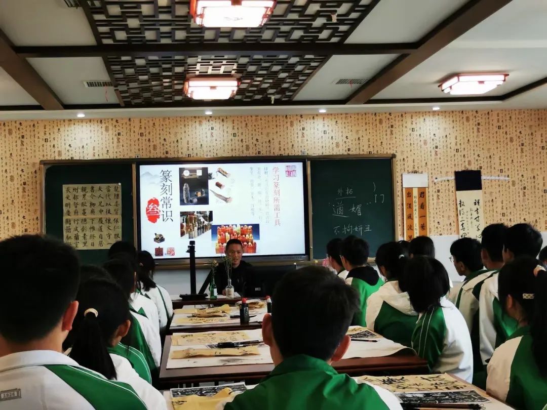 篆刻项目工作室主持人罗贵文老师为大家带来讲座《仪陇篆刻的发展与传承》。罗老师是中国书法家协会会员,篆刻作品多次获全国大奖,他介绍了为仪陇篆刻做出巨大贡献的老一辈篆刻艺术家文维义先生、周杰峰先生、以及中青年艺术家许棚先生,并从学习篆刻艺术的识篆、写篆等几个重要步骤亲自示范执刀方式,播放了仪陇县书法家协会主席许棚老师的视频讲解《仪陇篆刻发展史与现状》,并通过写稿、上石、制印、拓印等步骤带领现场师生共同制作精美的印章,引起了大家极大的兴趣,受到现场一致好评。