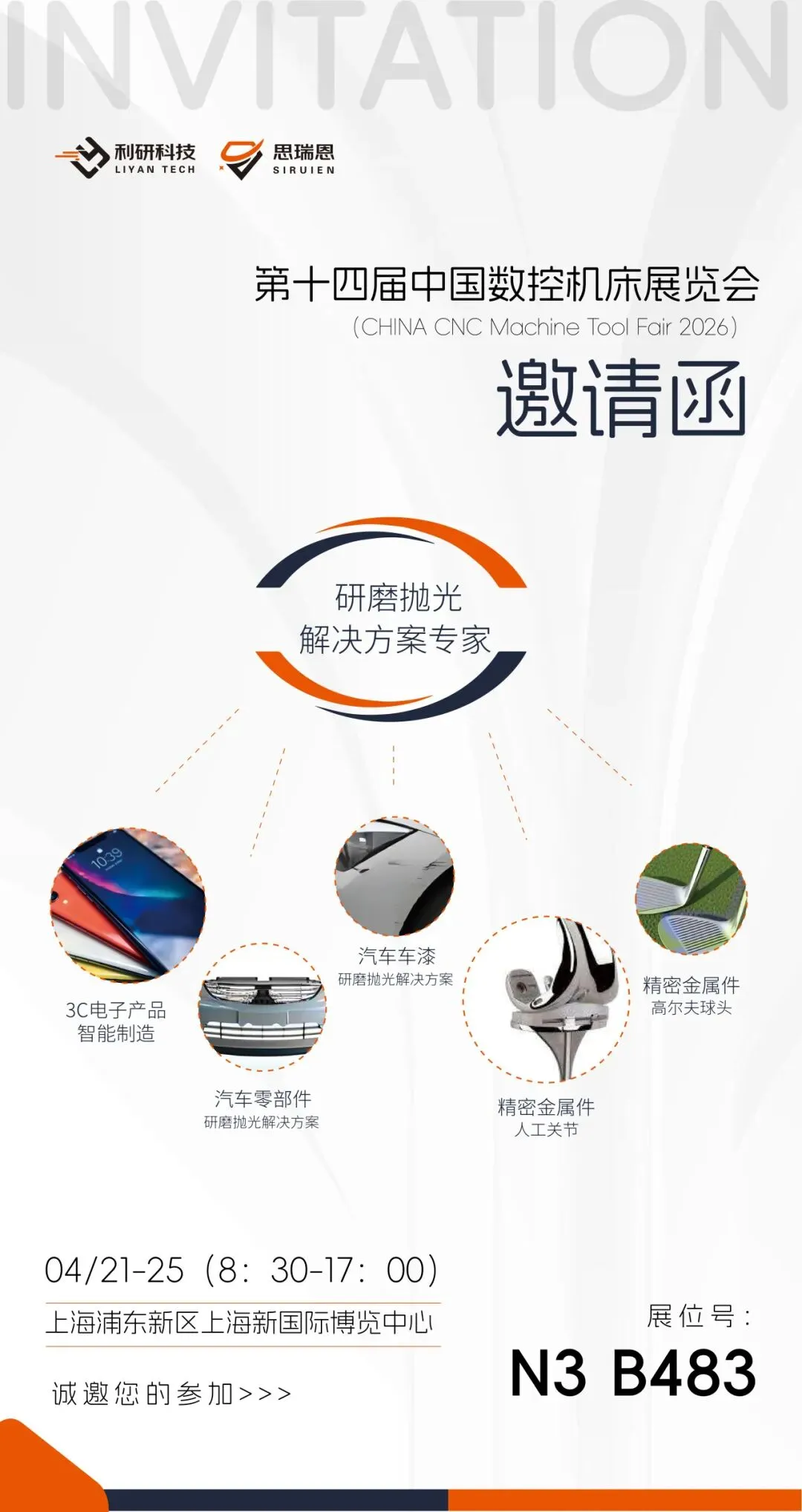 诚邀您拨冗莅临,近距离感受我们在精密研磨抛光材料、数控加工配套耗材领域的最新成果与解决方案,依托河北思瑞恩在高端研磨领域的技术优势,共同探讨高端制造、智能加工的创新可能,共寻产业合作新契机。