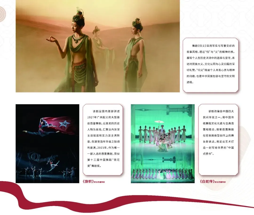 广州芭蕾舞剧院现保留大型舞剧20余部,荣获国际、国家、省、市级奖项200余个,如第十三届“文华大奖”及全部文华单项奖等。其中,原创芭蕾舞剧《旗帜》获中国舞蹈“荷花奖”舞剧奖、全国舞蹈展演优秀剧目、广东省“五个一工程”奖、国家艺术基金资助等;《白蛇传》获中国戏剧节优秀剧目、广东省“五个一工程”奖、鲁迅文学艺术奖、国家艺术基金资助等。2026年,广州芭蕾舞剧院全新原创剧目《归义》即将公演,敬请关注“广州芭蕾舞剧院官方”公众号。