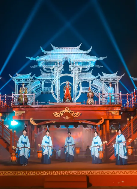 先打卡琅琊古城,建议换上一身汉服,漫步在青石板铺就的古城街巷,仿佛穿越回千年琅琊,沉浸式解锁“演艺之城”的独特魅力。这里有全天候国风演艺轮番上演,三大核心演艺不容错过,每一场都能带你读懂琅琊文化的厚重与浪漫。