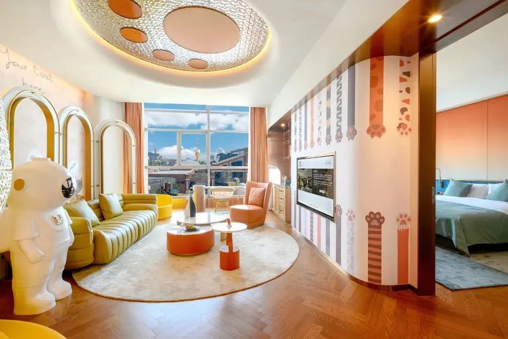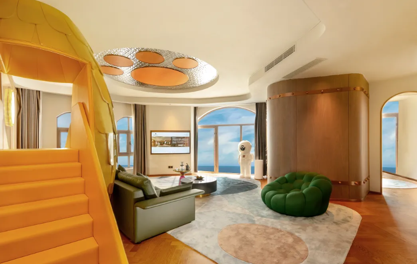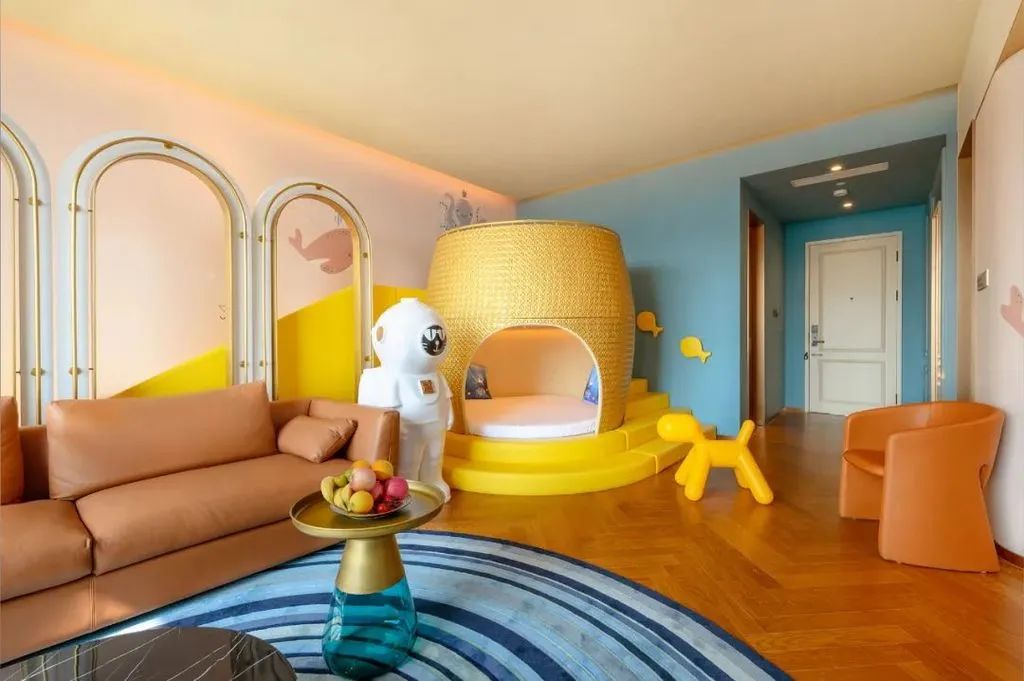 家庭客人推荐入住80㎡的主题亲子超享套房或主题亲子海景套房。主题亲子超享套房,有圆床和大床,房间带有滑滑梯。
