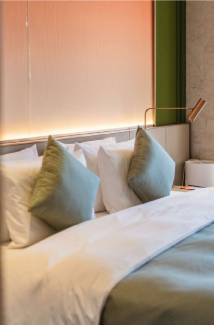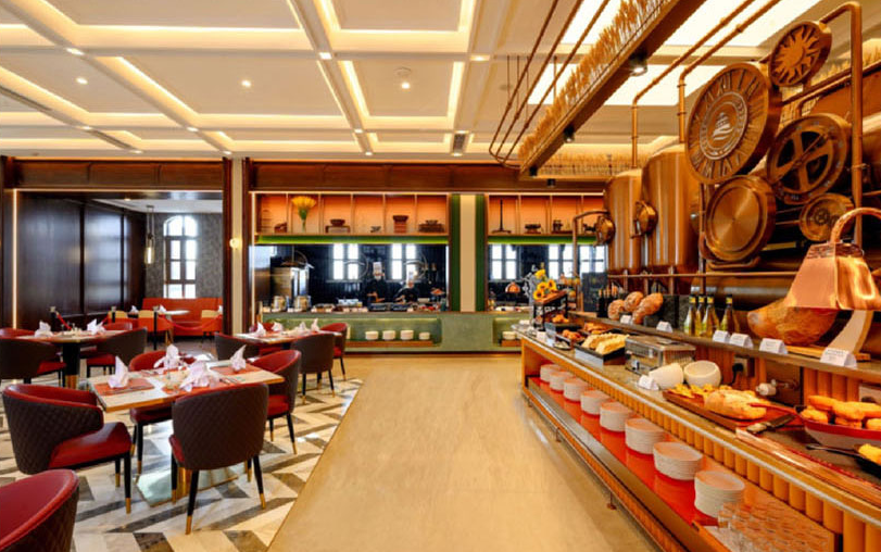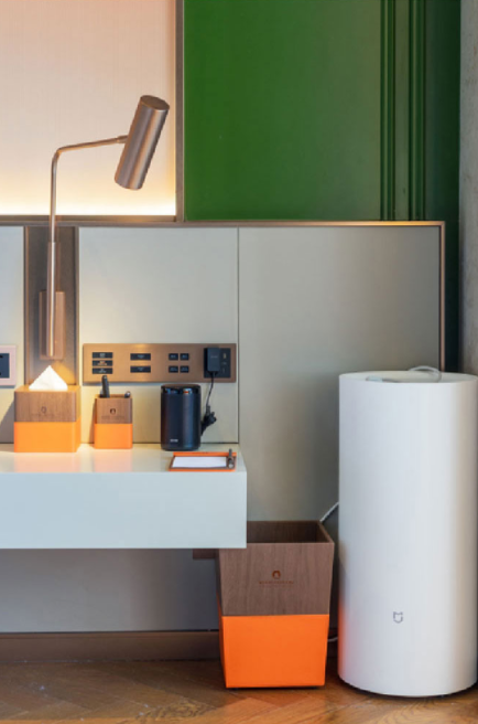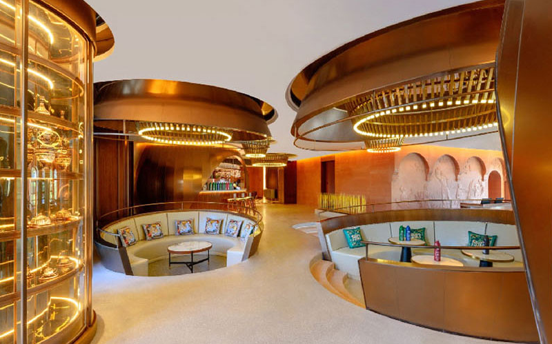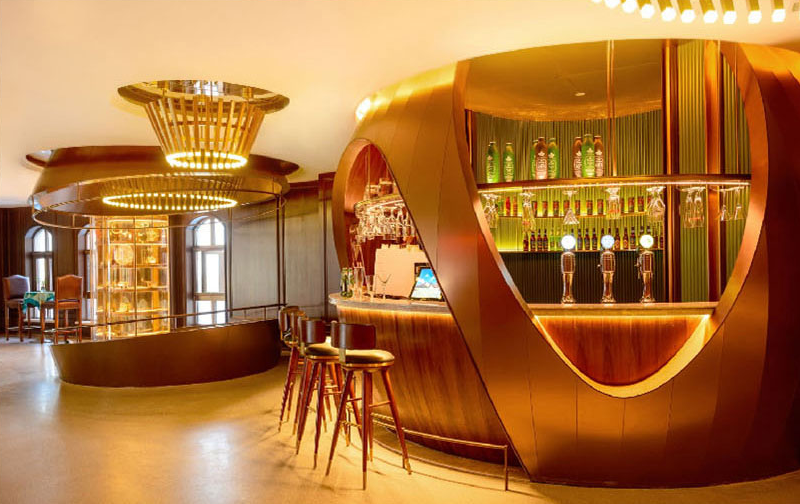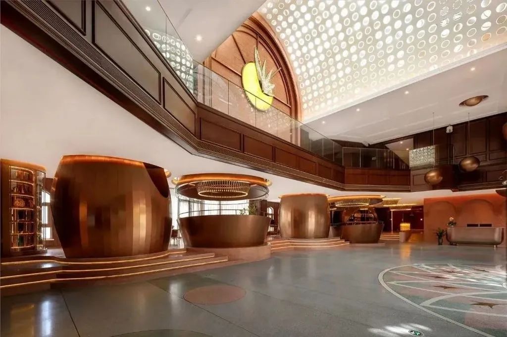 酒店大堂主色调为铜红色,天花板上的酒桶造型和麦穗造型,都和啤酒的发酵息息相关。大堂休息区被别出心裁地设计成了酒桶形状。