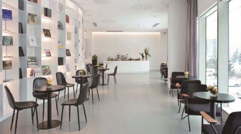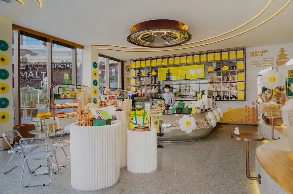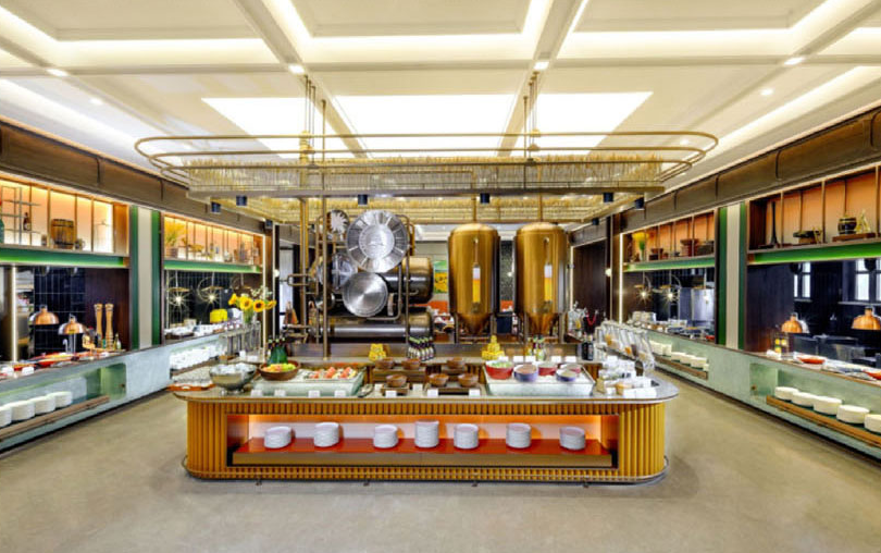 △大堂上方是麦穗造型,休息区是酒桶造型,天花板上有发酵元素
