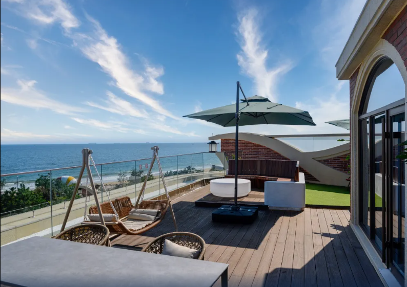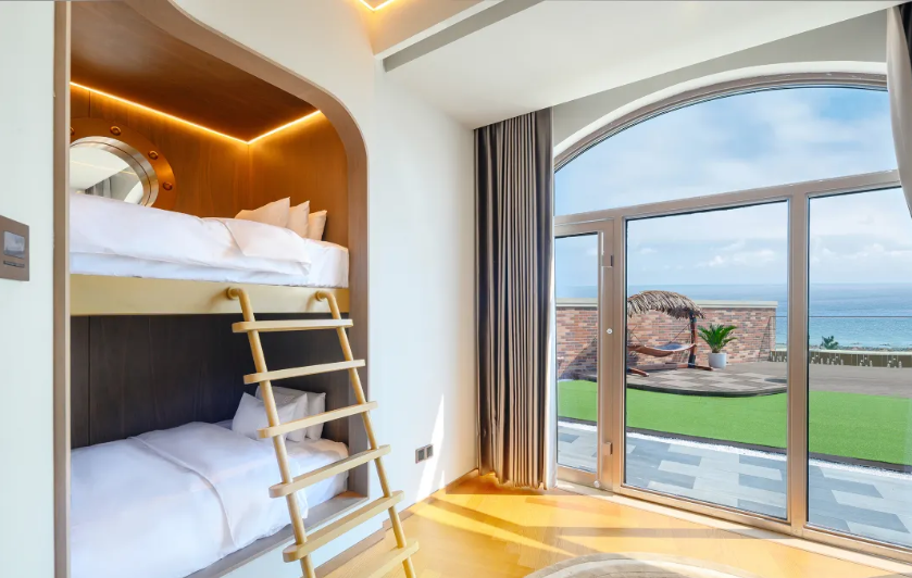特别是主题亲子海景套房里,面积有80㎡,遍布大海元素,有一张高低床和海景露台,适合2大2小入住。