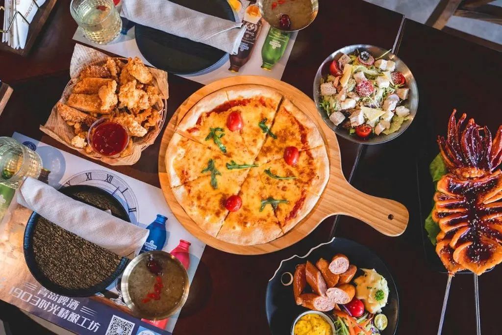 1903时光精酿工坊,在青岛啤酒生产线旁和新鲜精酿啤酒。是一个沉浸式的精酿体验中心,有青岛啤酒首条精酿生产线。装饰风格融合了德式复古、工业风和海洋元素,这里可以喝到多款精酿,吃到为啤酒而生的融合菜。透过脚下的透明玻璃,你可以一边用餐一边近距离观看啤酒的生产过程,这是青岛啤酒的精酿生产线,也是全国离海岸较近的精酿啤酒生产线。把新鲜的刚从发酵罐打出来的精酿送到你的嘴边。