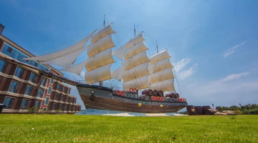 户外大草坪上,”停泊“着一艘帆船可供打卡拍照。