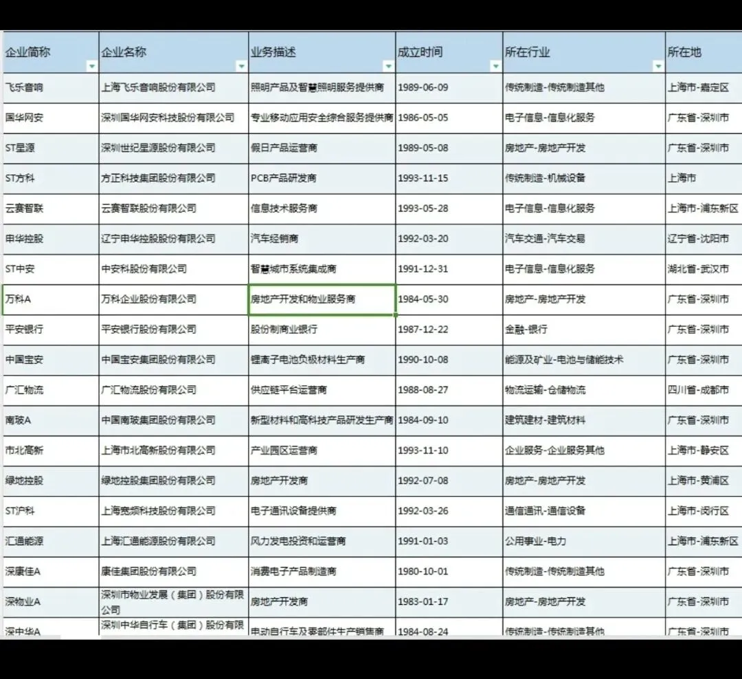 企业简称 企业名称 业务描述 成立时间 所在行业 所在地 详细地址 联系电话 企业网址 企业简介 邮箱 参保人数 上市状态 股票代码 交易所 上市时间 当前轮次 当前融资金额 单位 当前估值/市值 单位 融资总金额 单位 融资总次数 被并购总金额 单位 被并购总次数 新股发行总金额 单位 新股发行总次数 本轮投资方名称 本轮投资机构类型 本轮投资金额 单位 本轮交易股权比例 交易轮次 交易时间 融资/交易金额 单位 交易股权 交易状态 投后估值 单位 交易类型 交易方式 支付方式 是否关联交易 重大资产重组 交易或发行价格 单位 交易或发行股份数量 上市首日收盘价 单位 发行费用总计 单位 投资方名称 退出方名称 中介名称 人物名称 职位 股东名称 出资比例 认缴出资 单位 法人代表 注册资本 单位 经营状态 统一信用代码 经营范围 注册地址 企业产品 企业商标 企业业务 专利数量 商标数量 软件著作权数量 作品著作权数量 网站备案数量 资质证书数量 司法风险数量 经营风险数量