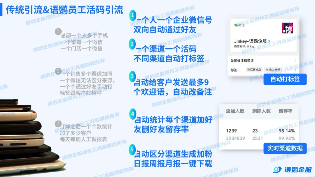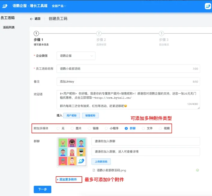 针对展会早晚班轮值的场景,灵活的活码机制同样大有作为。上午人流高峰,品牌方可在后台增加接待客服,多位经理同时接客;下午撤展时段,只需保留一两位值班人员。此外,投资人扫码加微后,招商经理还能顺势递上交流群链接。结合语鹦企服的自动拉群与无限群活码功能,满200人自动创建新群,轻松打造从线下引流到社群转化的私域闭环。