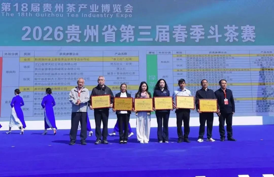 现场还公布了贵州省第三届新茶饮职工技能大赛、贵州省第三届春季斗茶大赛竞赛结果并颁奖,同步为遵义市农产品推荐官授牌、出口茶叶“大基地”揭牌。